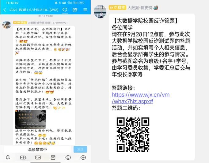 在日常工作中,大数据学院还组织预防电信诈骗短视频系列征集活动、防诈主题观影活动,以视频、图文等形式开展反诈活动,并组织学生签署防诈承诺书、通过学院媒体平台发布反诈提醒推文,以及利用周末安全提醒、防诈主题教育等一系列防诈活动,把大学生防诈骗意识和行动融进校园生活中,推动学生预防电信诈骗的意识入脑入心,共筑和谐平安的“无诈”校园环境。