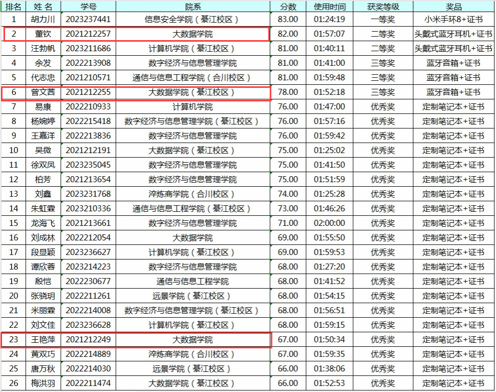 通过前期积极备赛,专注答题,最后王老师指导的三位同学均在本次校级选拔赛中获得了不错的名次。结合去年的市赛选拔规则,今年应该会有两位同学可以顺利进入市级选拔赛。当然,成绩只是一部分,最主要的还是希望同学们能够通过本次比赛,学到更多实用的知识与技巧,以助力同学们的学习、生活乃至于今后的工作。