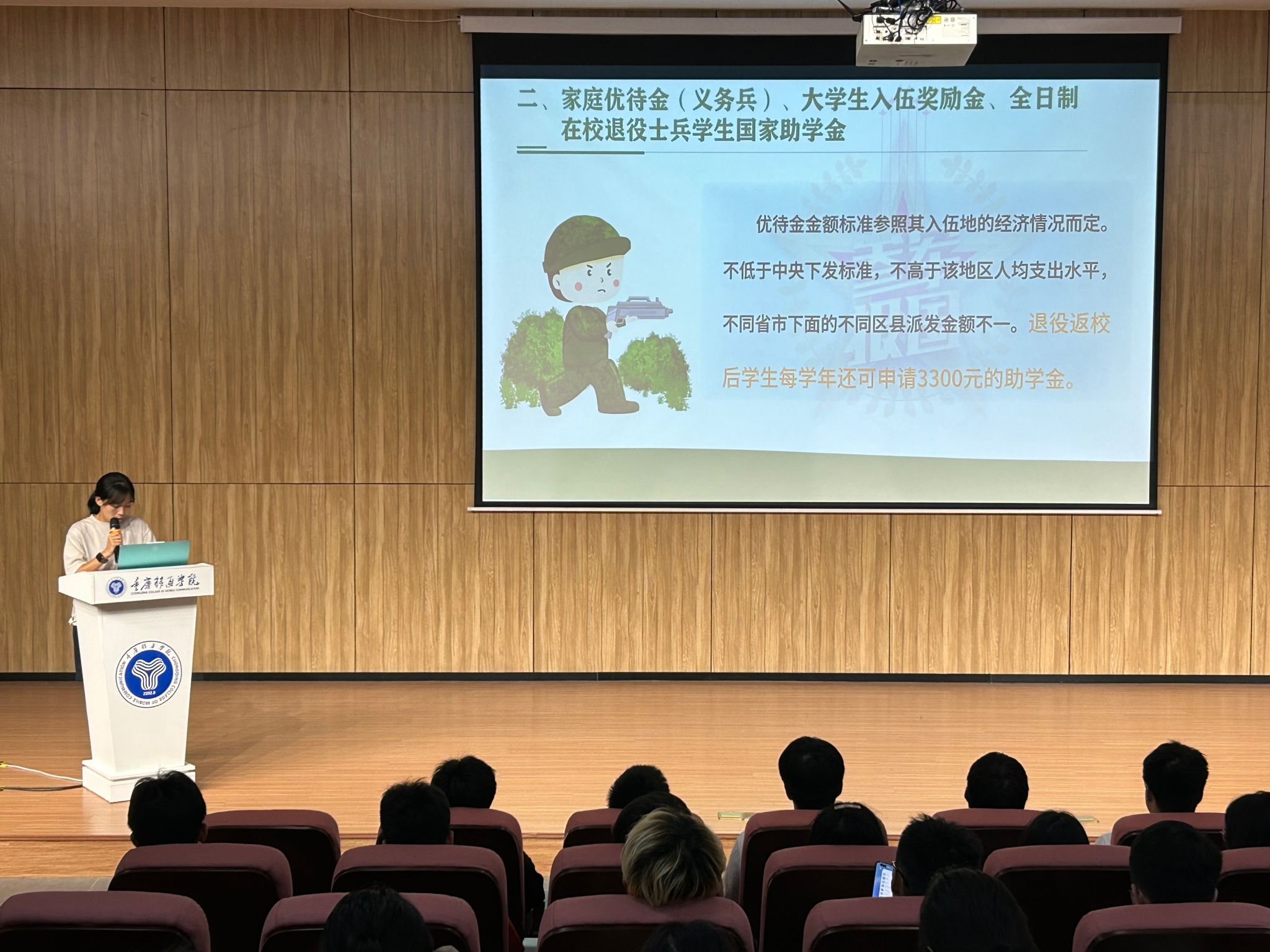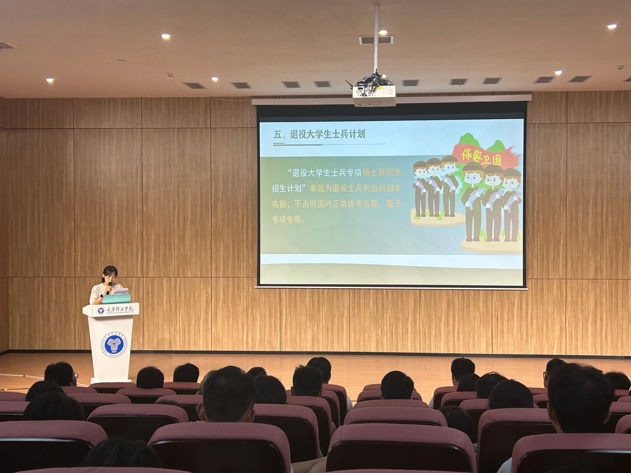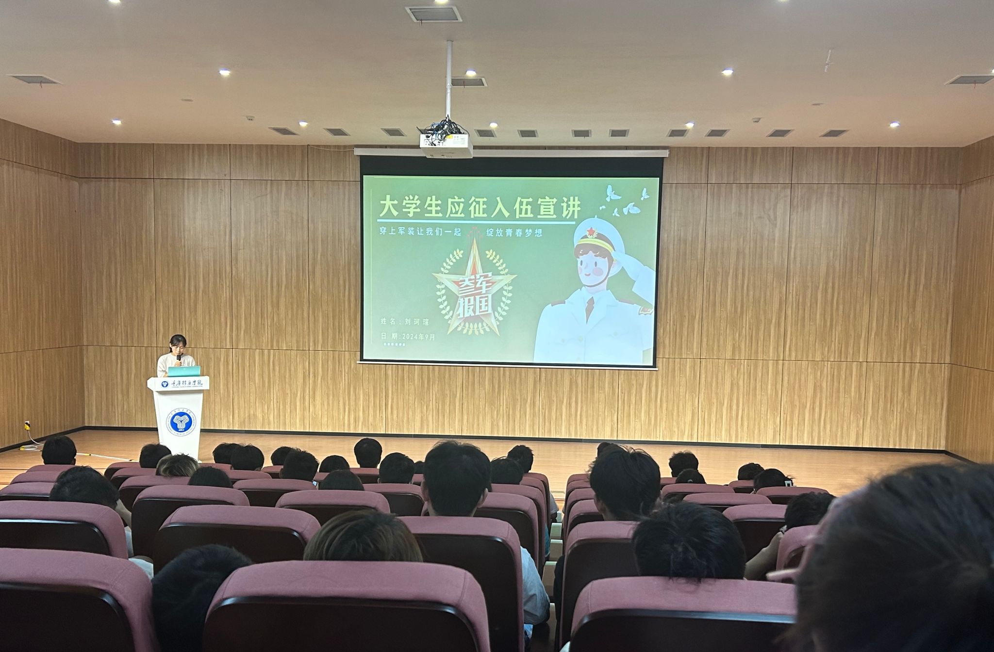 “在这五年时间里,我见证了许多迷茫的同志通过应征入伍,完成了自己的蜕变,找到了自己奋斗目标,明晰了自己前进的方向,我也是其中受益的一份子。”在宣讲过程中,刘珂瑄同学简要介绍了自己的军旅故事,用亲身经历向在场同学们展示了军人的责任与使命、光荣与荣耀,以及应征入伍对个人成长的深远影响。