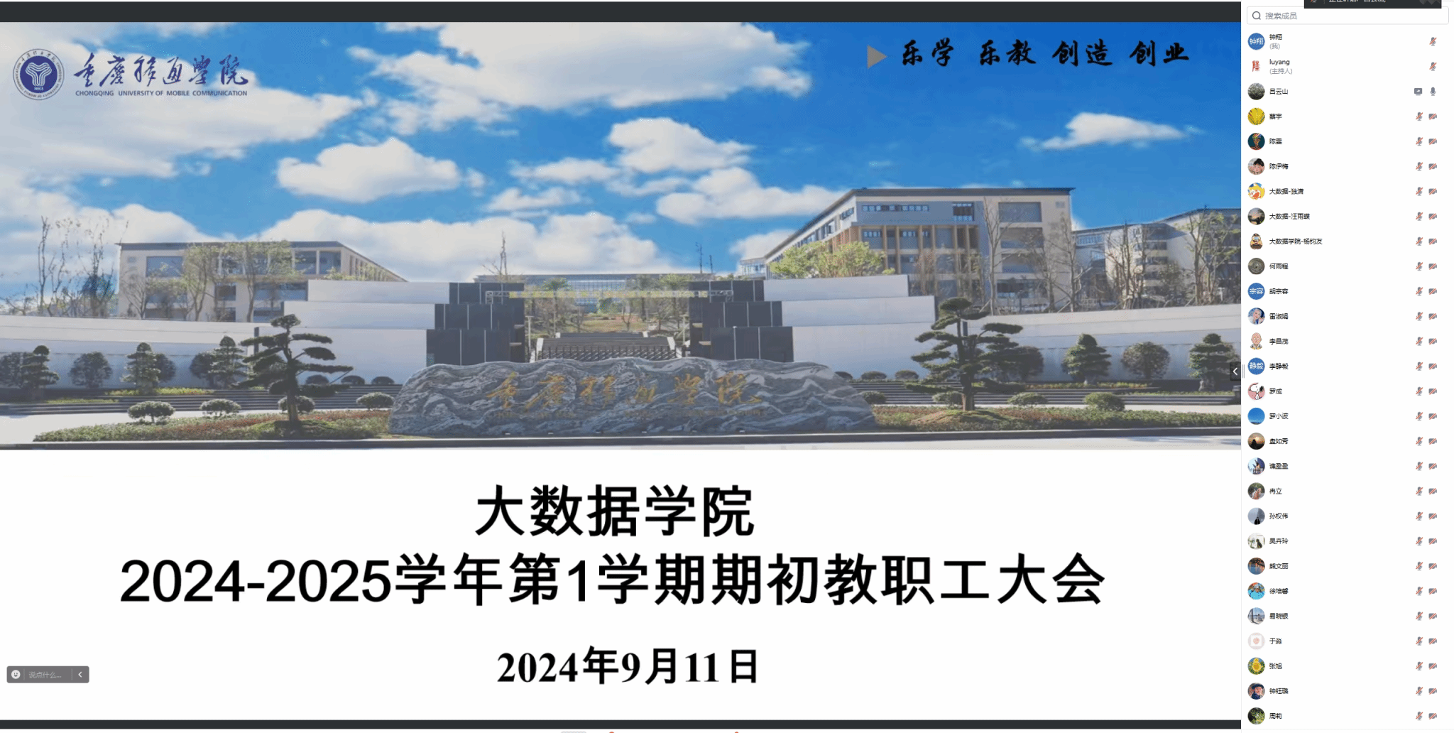 9月11日,大数据学院通过腾讯会议线上召开了2024-2025学年第一学期期初教职工大会,学院全体教职工悉数参会。本次会议由潘显安院长与吕云山院长共同主持。