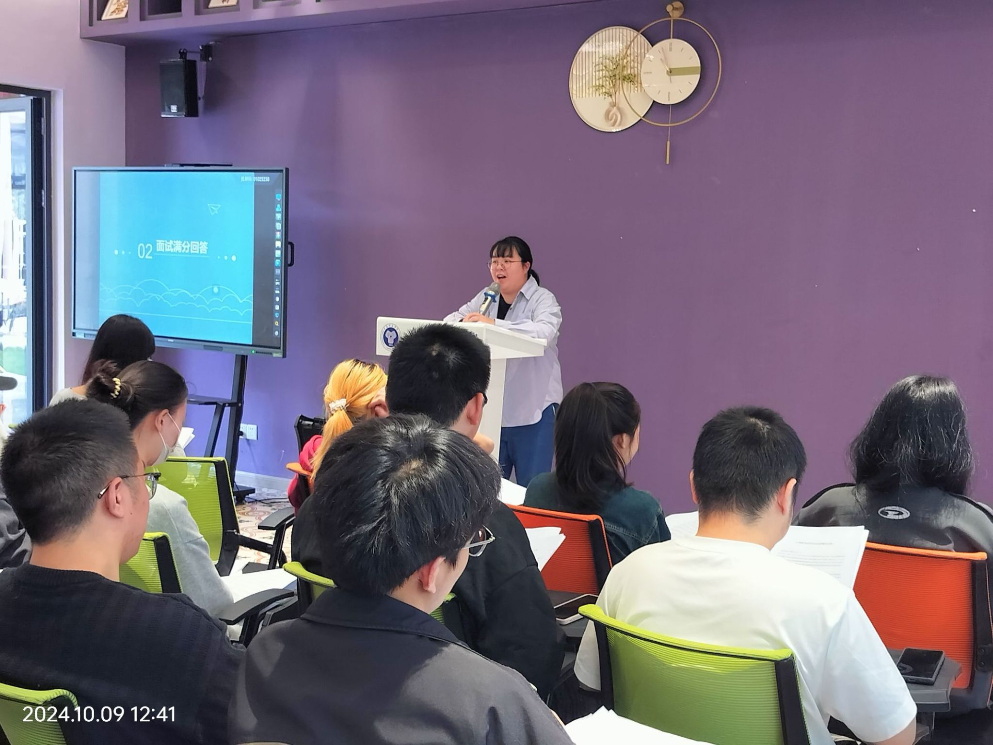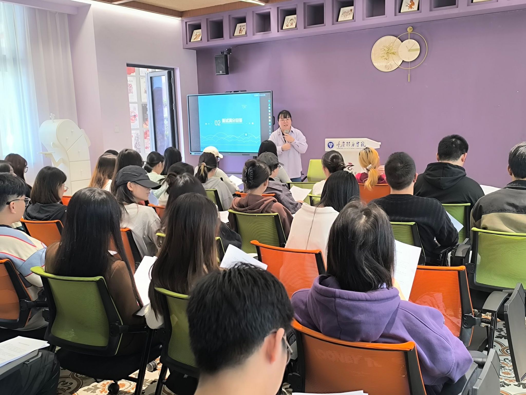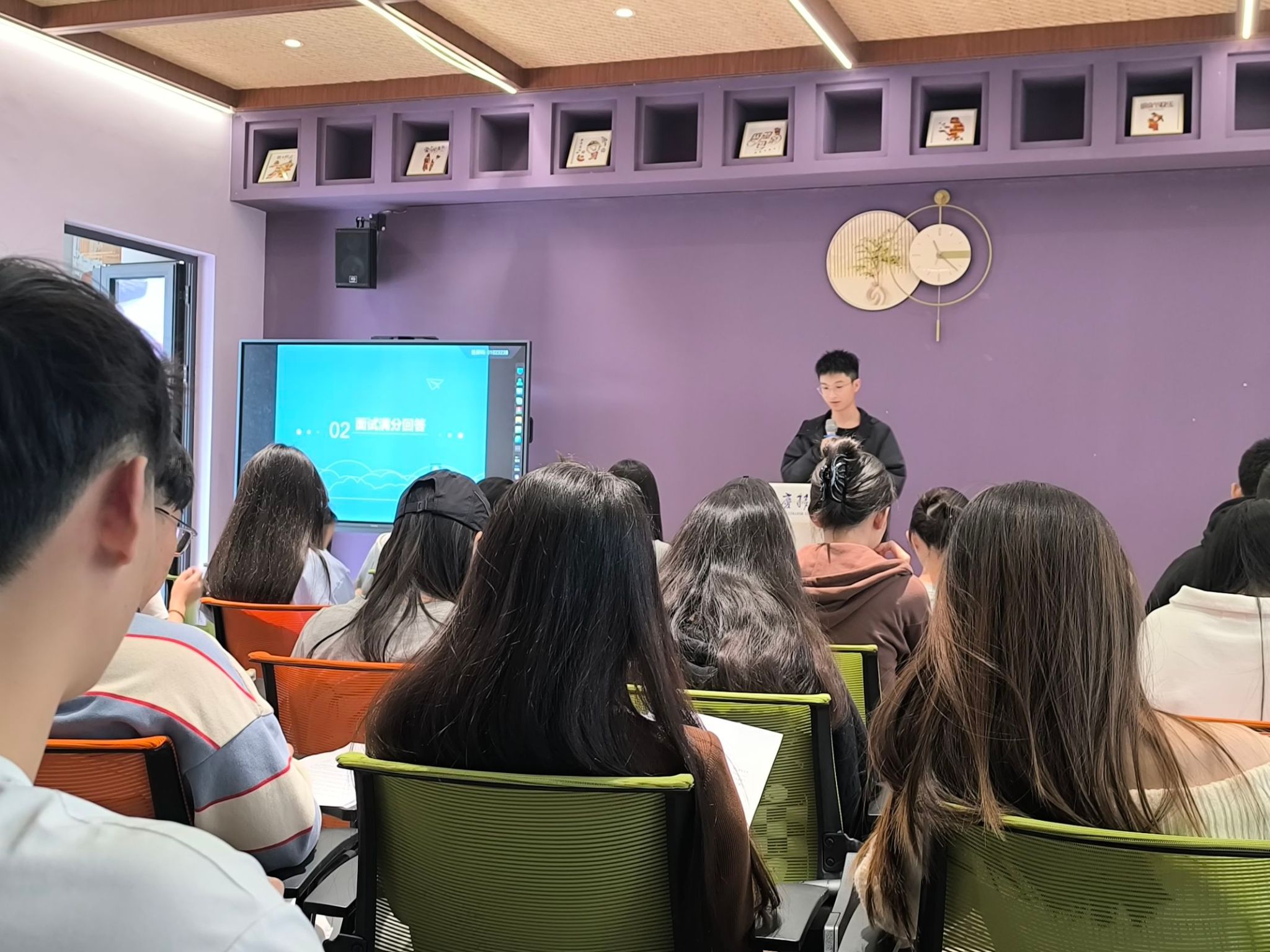 随着朱老师对HR黑话的解读,现场气氛逐渐升温,变得活跃起来。接下来,朱老师邀请同学们上台,分享自己对职场的看法。同学们浏览完工作人员提前发放好的资料后,经过一番头脑风暴,多位同学勇敢地起身,表达了自己对现阶段职场独特的见解。他们不仅分析了自身的优势,还畅谈了自己理想的求职岗位。整个过程中,台上同学的精彩发言与台下同学们的积极回应形成了良好的互动,使得现场的参与热情持续高涨。