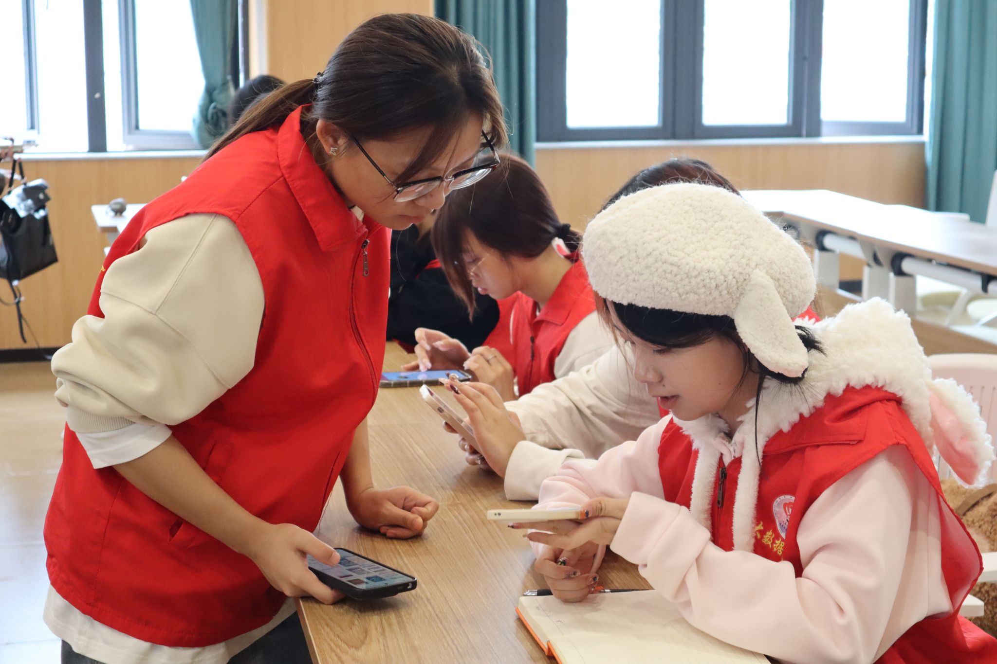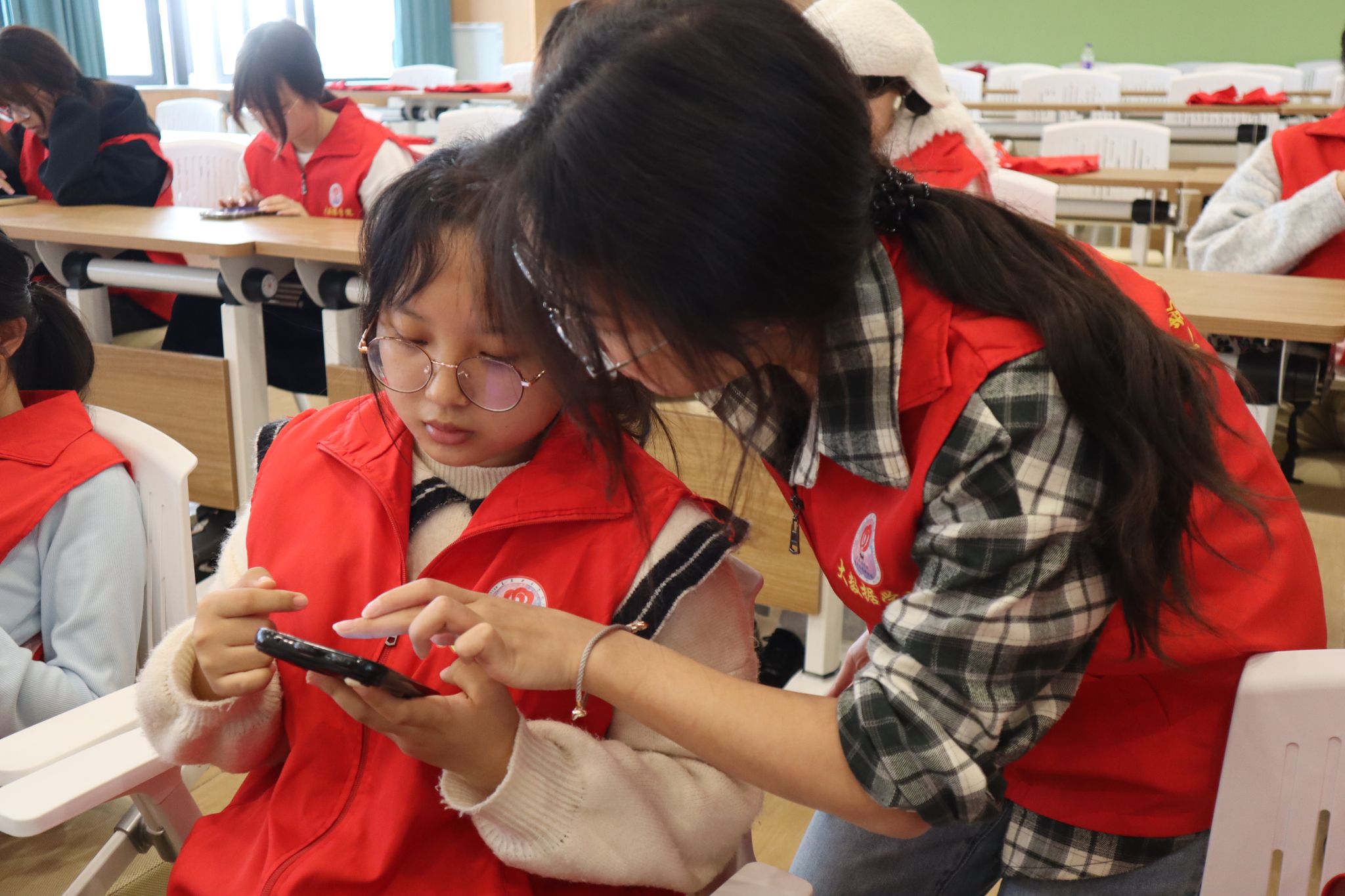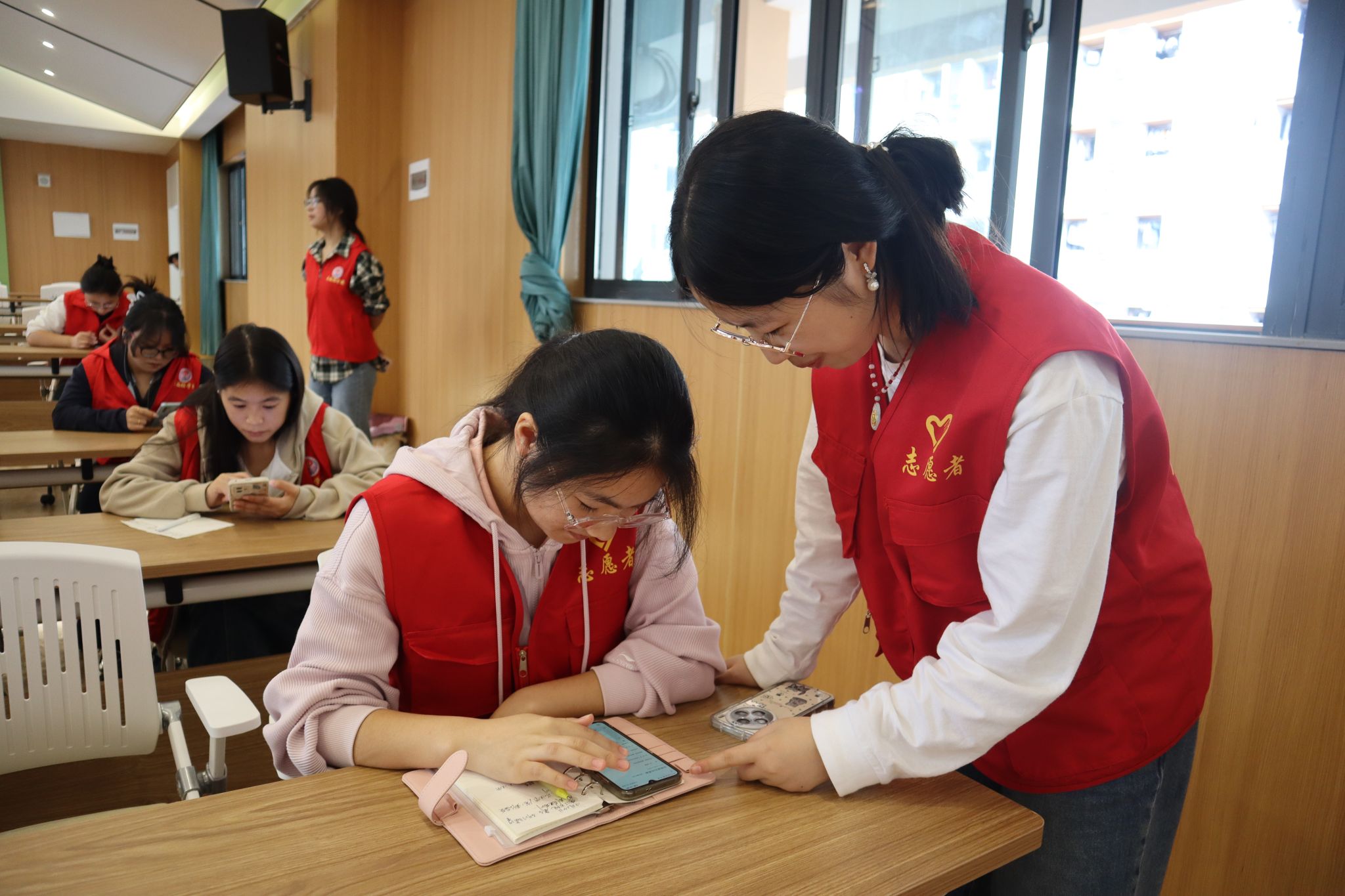 在王祖恒同学的细心讲解下,同学们都聚精会神地聆听着,并不时在笔记本上记录下关键信息,将所学的知识与技能带回班级,引领更多同学加入志愿服务。在实践操作环节中,大家纷纷举手提出自己疑问。青协志愿者们一一耐心解答,现场气氛热烈而融洽,激发了同学们投身志愿服务的热情。