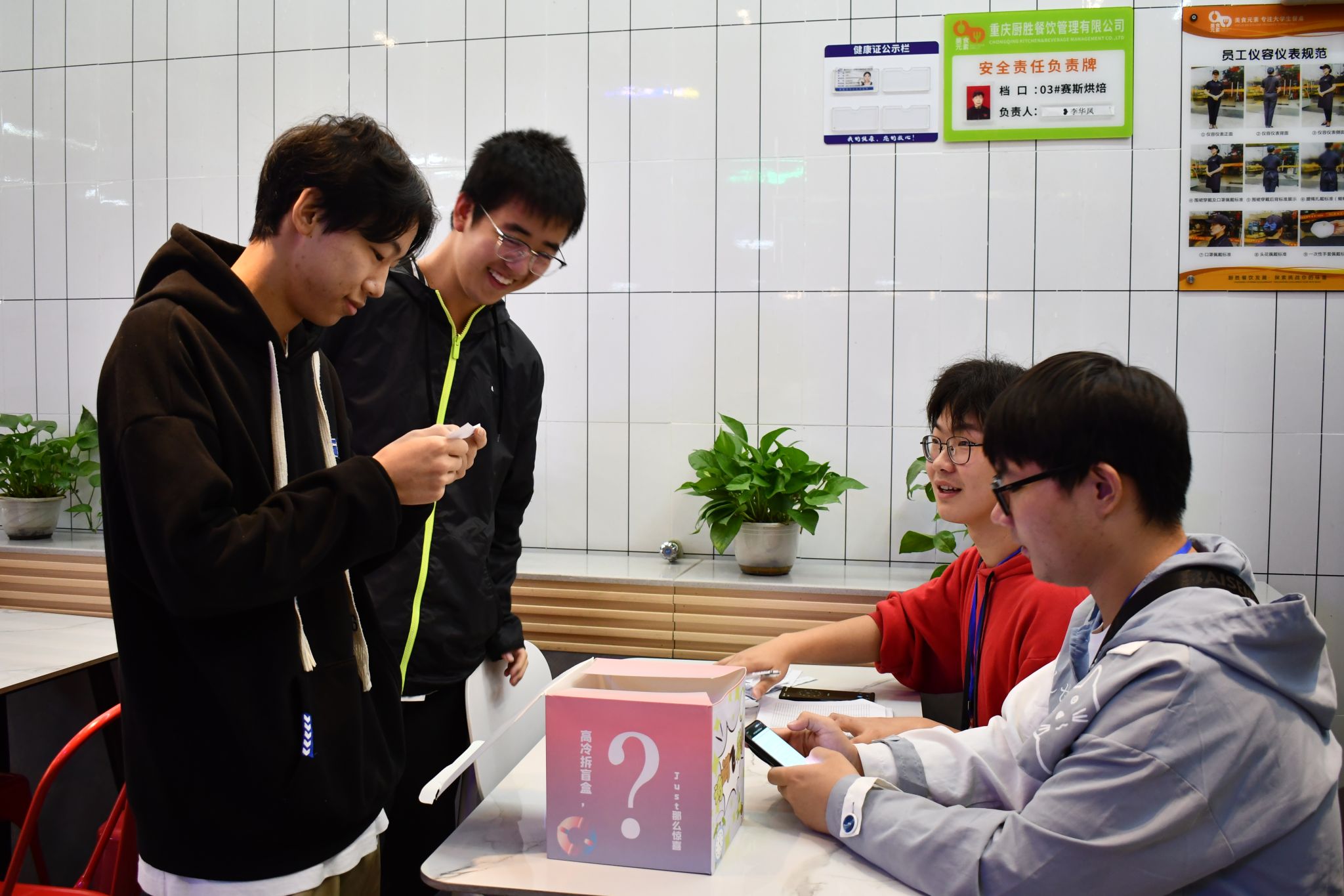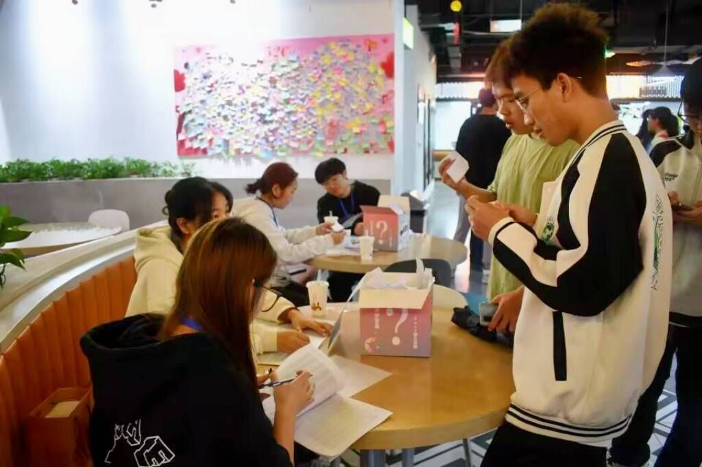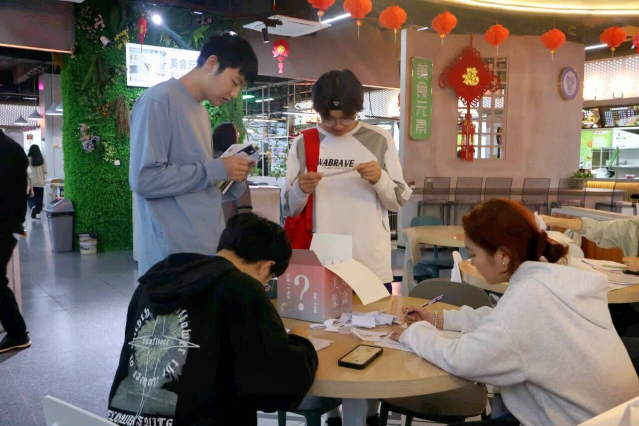 在食堂门口,四六级英语角以两人一组的形式进行,一人翻译,一人回答单词,这种互动式的学习方式激发了同学们的学习热情,也让英语变得生动有趣。踏入食堂内部,权益寻宝和防骗小课堂的问答挑战同样备受欢迎。同学们随机抽取纸箱中的问题卡片,或低头沉思,眉头紧锁;又或自信满满,从容作答。而在诗词飞花令环节中,同学们才思泉涌,一句句经典的诗词在他们的舌尖跳跃,激荡起一阵阵文化的涟漪。整个食堂内,这样的场景此起彼伏,形成了一幅生动而活泼的画面。