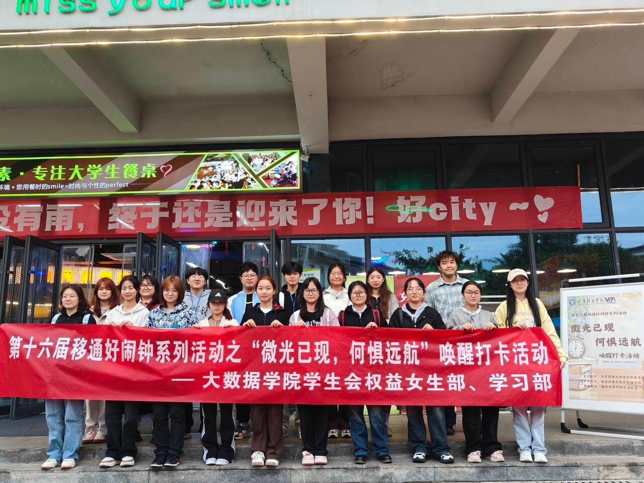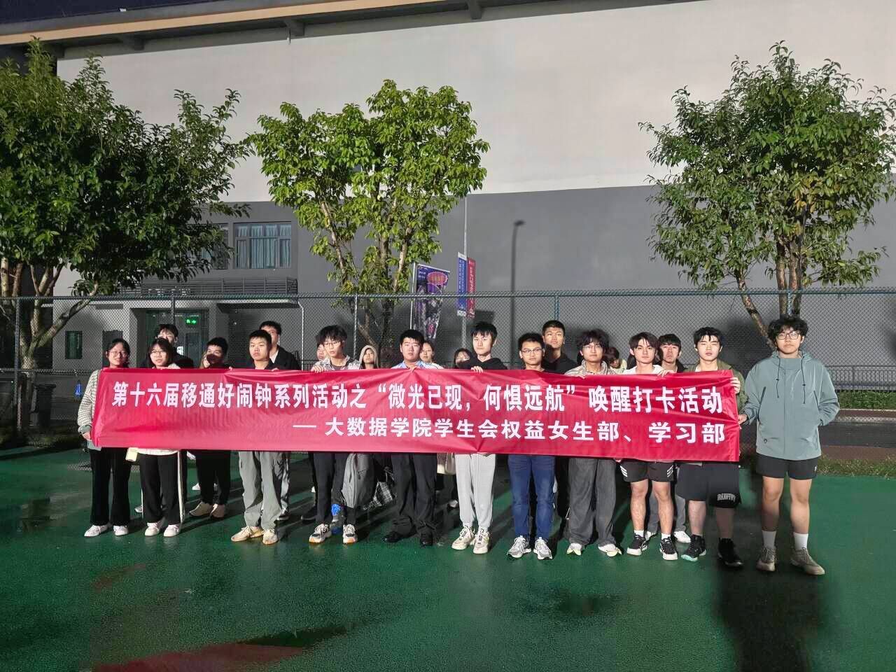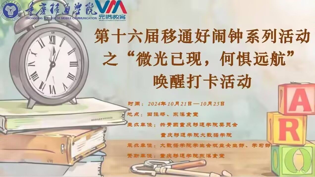 威尔科克斯曾言:“一天之中最美好的时光在黎明。”近日,重庆移通学院大数据学院主办的第十六届移通好闹钟系列活动之“微光已现,何惧远航”唤醒打卡活动,于10月21-25日在綦江校区如期举行。本次活动旨在通过一系列趣味盎然的晨起打卡活动,激励同学们唤醒自身潜能,探索无限可能。