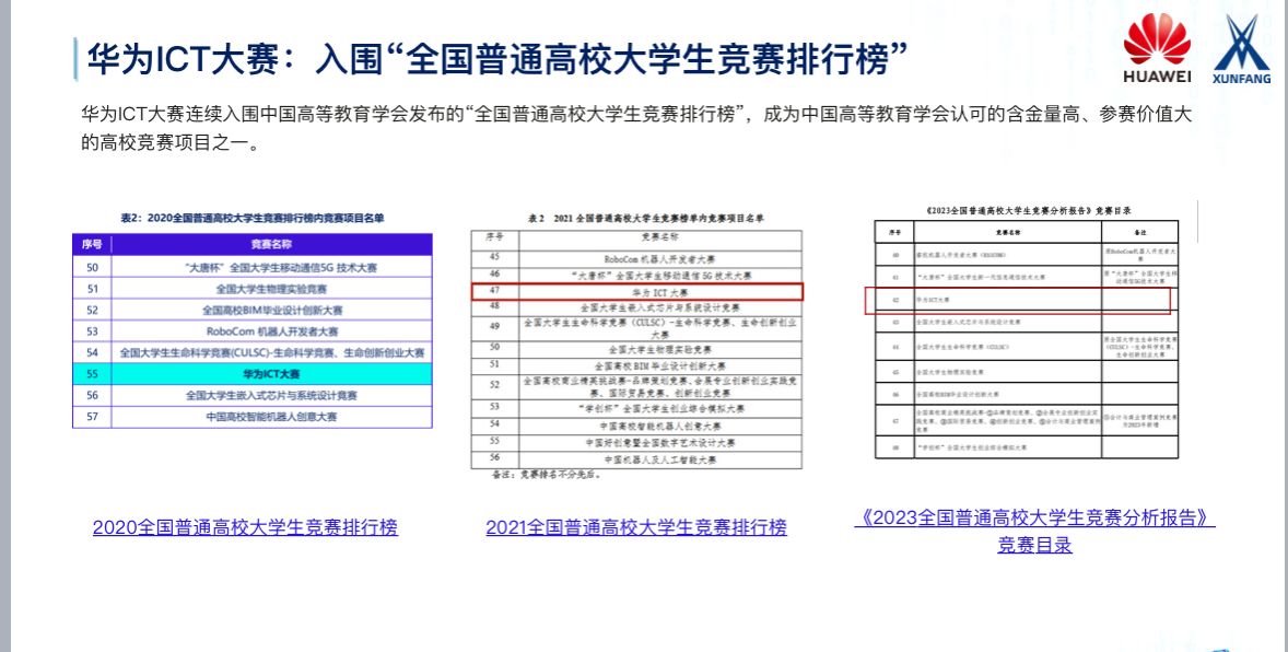 据了解,华为ICT大赛是华为公司打造的面向全球高校的年度ICT赛事,大赛以“联接、荣耀、未来”为主题,以“I. C. The Future”为Slogan,协同政府、高等教育机构、培训机构、行业企业等,共同助力ICT人才生态繁荣。华为ICT大赛连续入围中国高等教育学会发布的“全国普通高校大学生竞赛排行榜”,成为中国高等教育学会认可的含金量高、参赛价值大的高校竞赛项目之一。