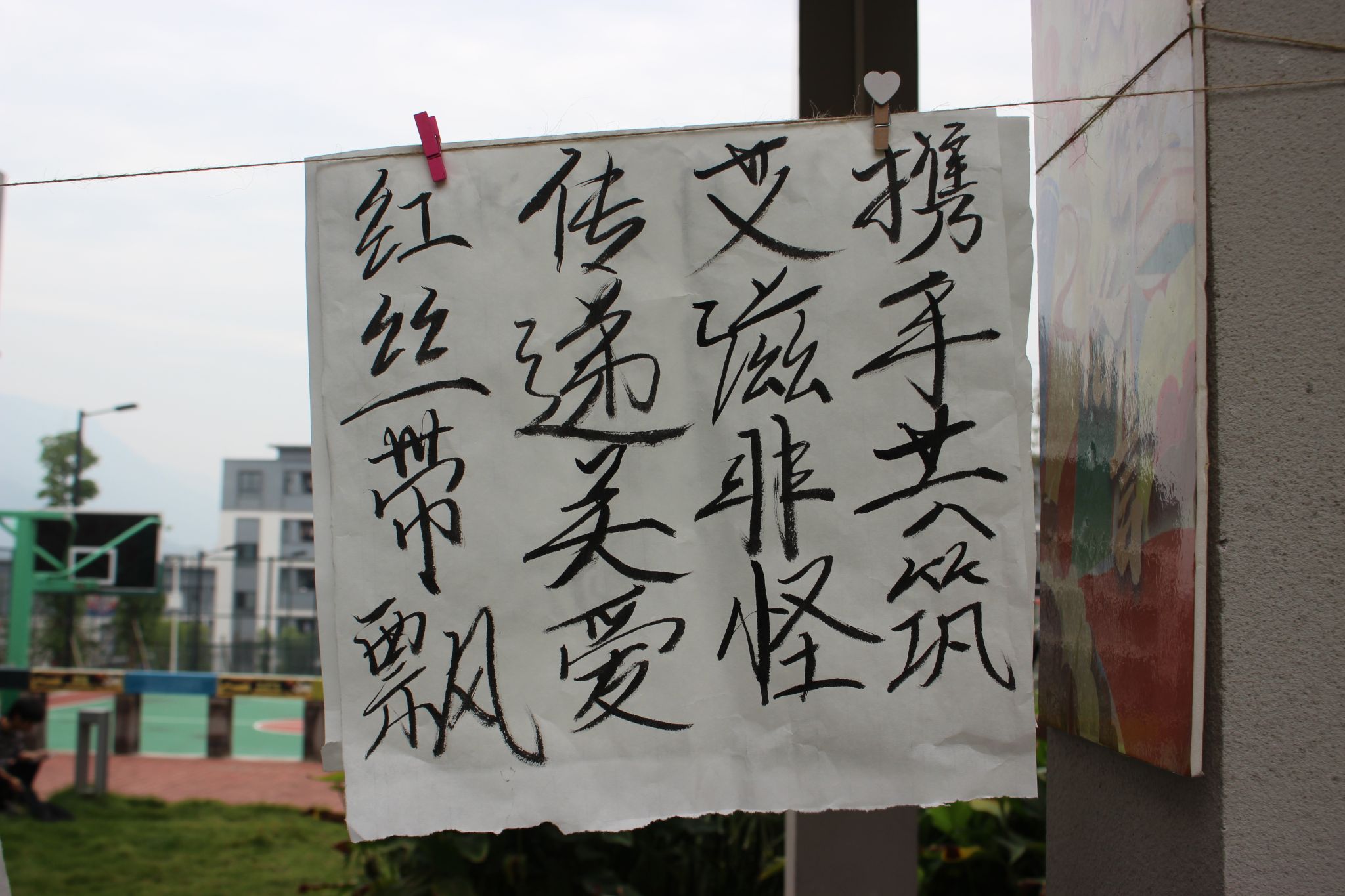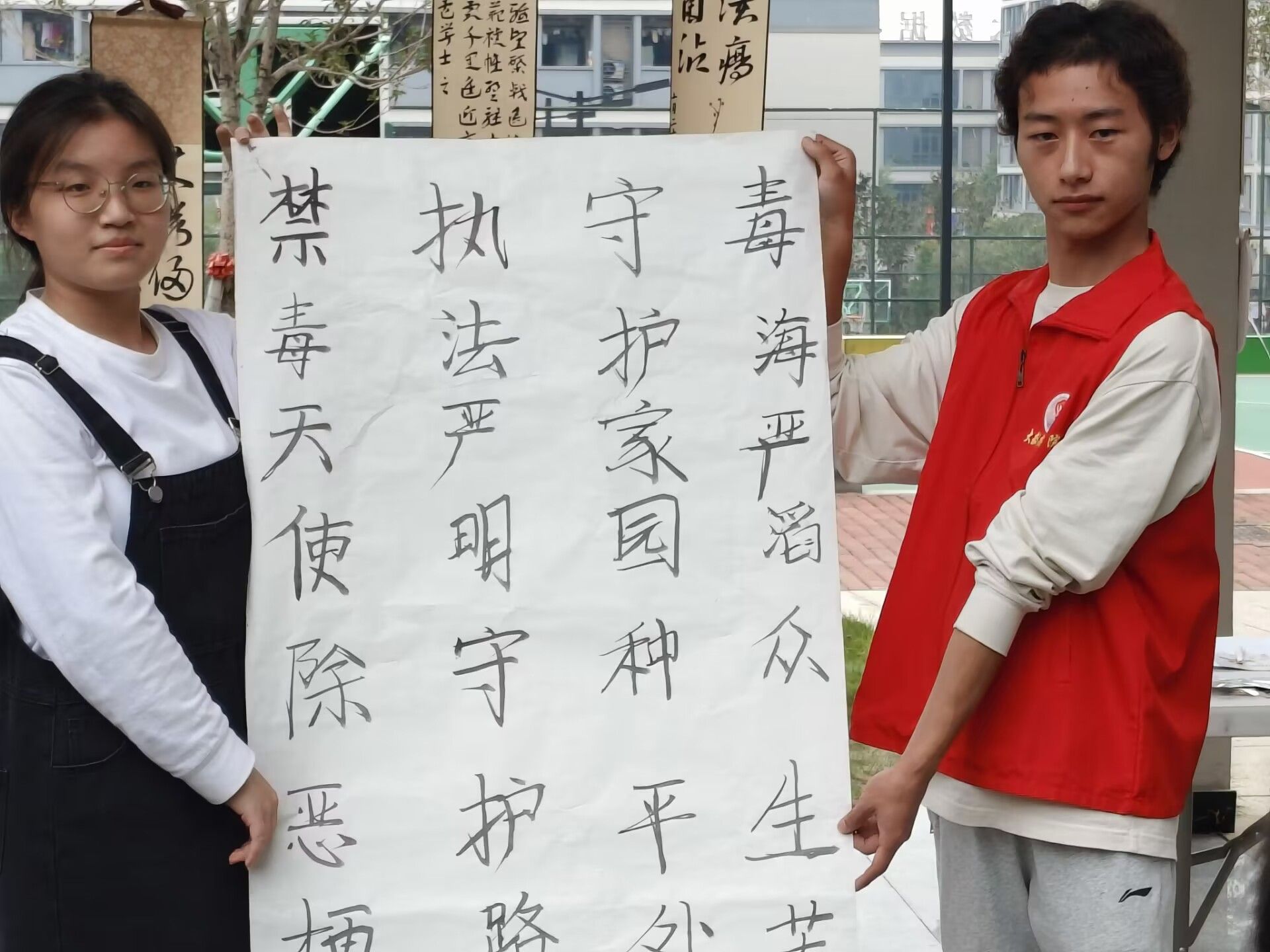 活动步入尾声,一幅幅赏心悦目的书法作品被呈现。同学们的字迹各具特色,有的清新飘逸、隽秀柔美,有的雄健有力、顿挫有致。同学们带着自己的优秀书法作品,与志愿者们合影留念。这些作品巧妙地将传统文化艺术与现代禁毒防艾宣传相结合,营造了一个积极且充满文化的活动氛围。通过书法这一独特而富有内涵的载体,禁毒防艾的理念深入人心,极大地激发了同学们参与禁毒防艾活动的积极性和主动性。