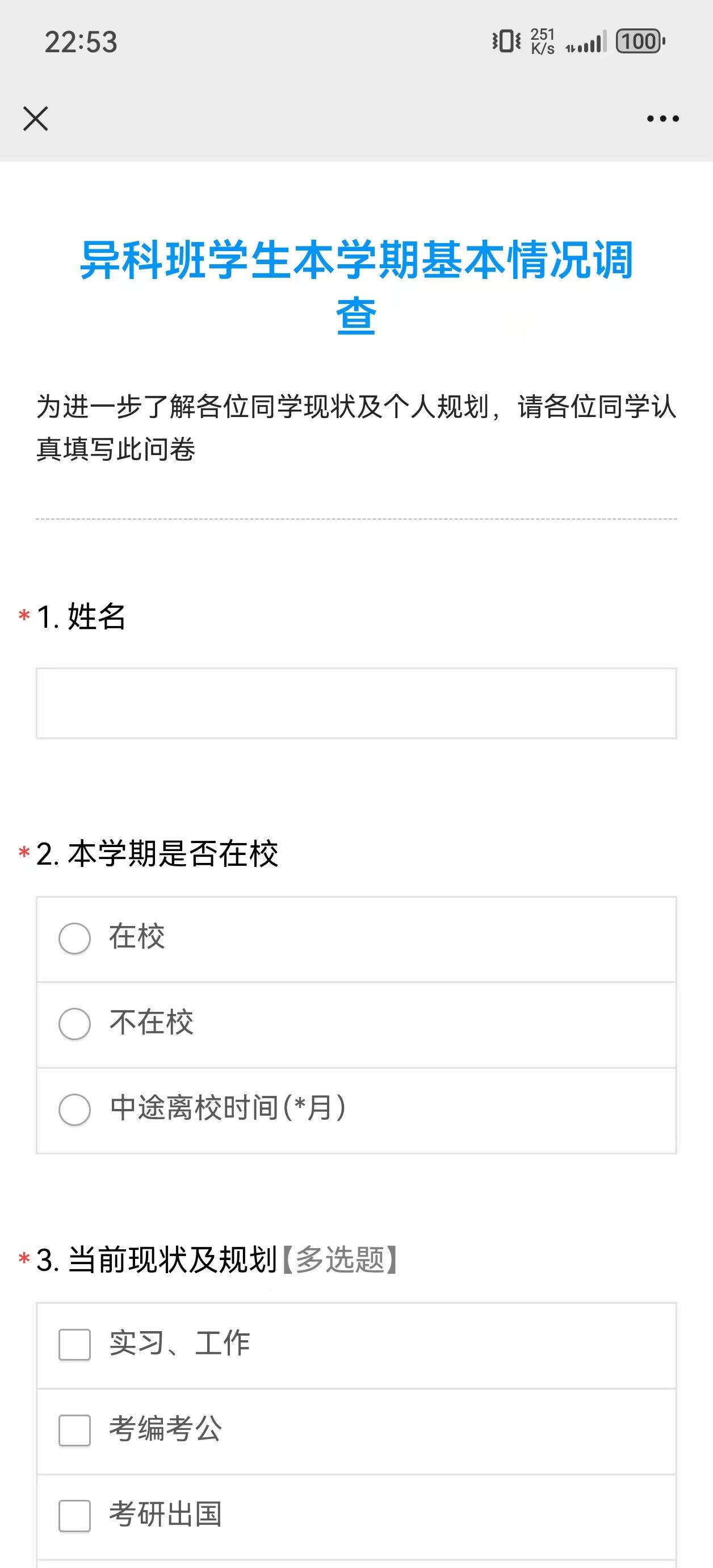 在见面会上,特别组织了一次问卷调查活动,旨在全面摸底异科班级学生在校的学习、生活情况以及对未来的打算。问卷内容涵盖了学生的目前状态、近期计划、未来职业规划等多个方面,旨在通过细致入微的调研,为每位学生提供更加精准的指导和服务。在谈及未来规划时,许多学生表示,他们已经开始积极准备考研、考公,就业或创业等相关事宜。目前考研报名已经开始,提醒学生把控好时间,好好复习,争取一举拿下。