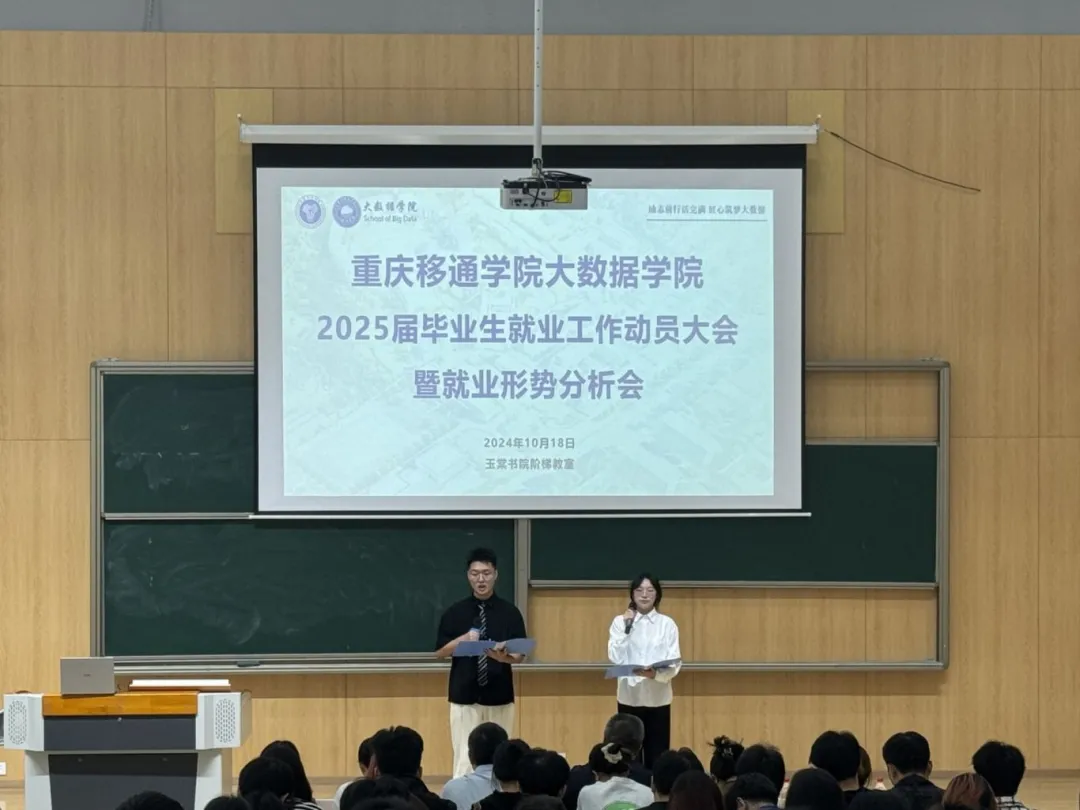 在如今这个激烈且复杂的就业形势中,毕业生们如何正确看待就业这个大形势又如何找到属于自己的工作呢?为全力做好2025届毕业生就业工作,提升毕业生就业质量,帮助毕业生了解就业形势,把握就业机会,做好职业与人生规划。大数据学院就业创业助理团于2024年10月18日14:00至15:30在玉棠书院阶梯教室开展了第九期就业沙龙活动——就业形势分析动员大会。本次活动特别邀请了大数据学院院长潘显兵、副院长吕云山、学工办公室主任李进,就创办公室主任蔡娜以及毕业班辅导员代表蒋娅娅老师为2025届毕业生进行指导。在各位领导、老师的指导,以及大数据学院就业创业助理团综合实践部的努力下,本次沙龙第九期活动取得圆满成功,未来,学院领导、老师以及各个部门将继续加大对毕业生就业的支持力度,做毕业生就业路上最坚实的后盾!