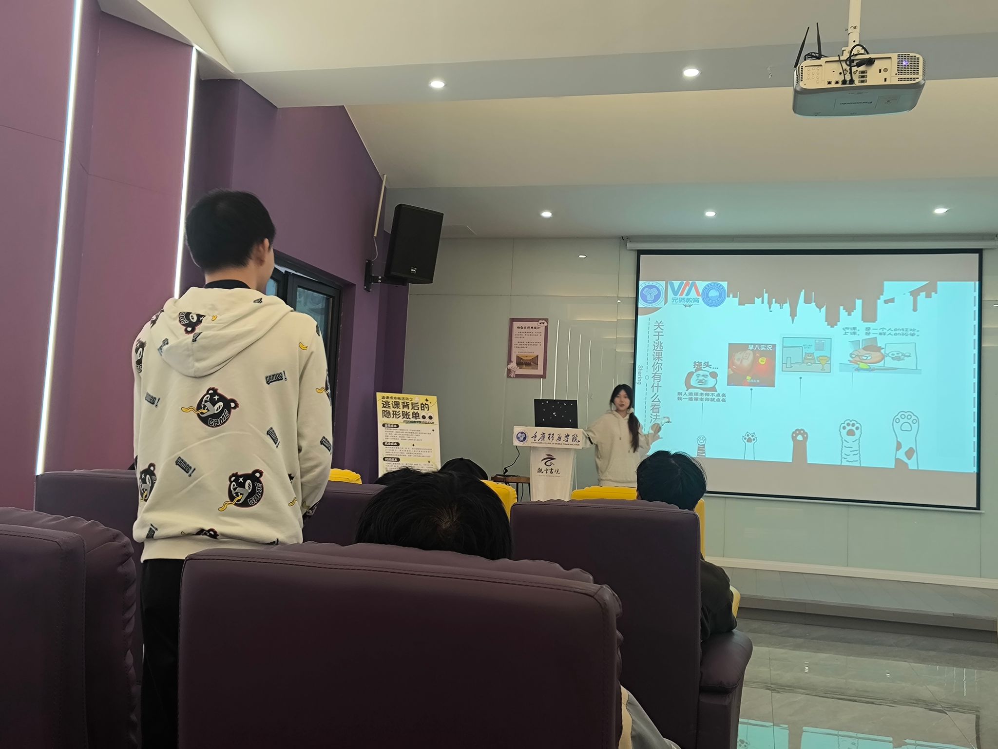 为培养学生的出勤意识,引导学生树立正确的学习观念,2024年11月12日16:30,由2023级数字媒体技术5班主办的逃课成本帐之“逃课背后的隐形账单”主题活动在观云书院秋分·多功能活动室顺利举办!以告诫同学们不要肆意挥霍青春,严于律己,不负韶华!