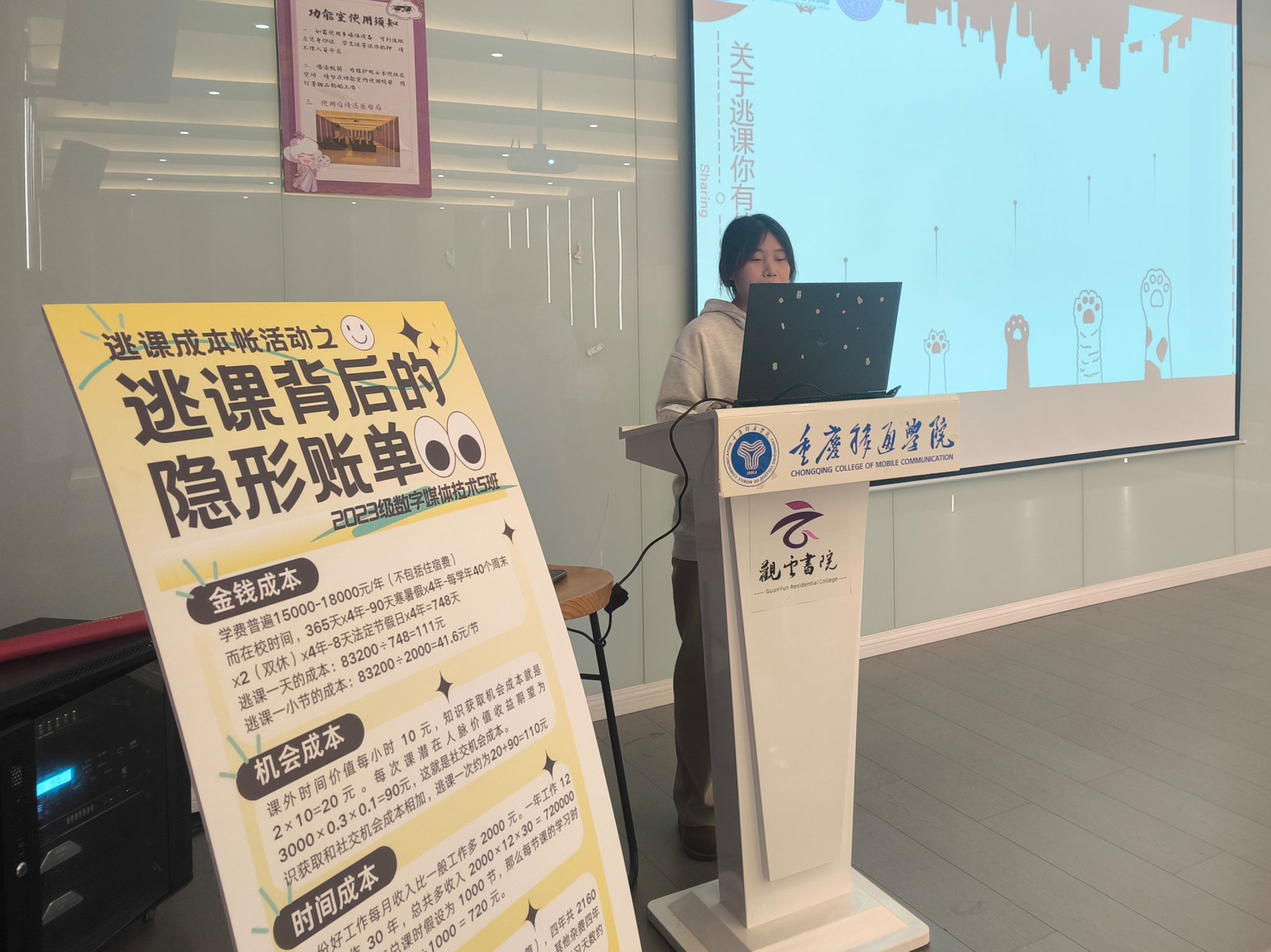 “根据计算,逃课一小节大约有41.6元…”随着主持人的声音响起,同学们对逃课成本进行了全面而细致的分析,这一分析不仅基于理论层面的探讨,更辅以了实际调查问卷所得的数据支撑,确保了分析结果的客观性和准确性。通过问卷统计,逃课所带来的成本远不止于学业上的落后,更涵盖了时间、机会乃至个人品德等多方面的损失,引起了同学们的广泛关注和深刻反思。
