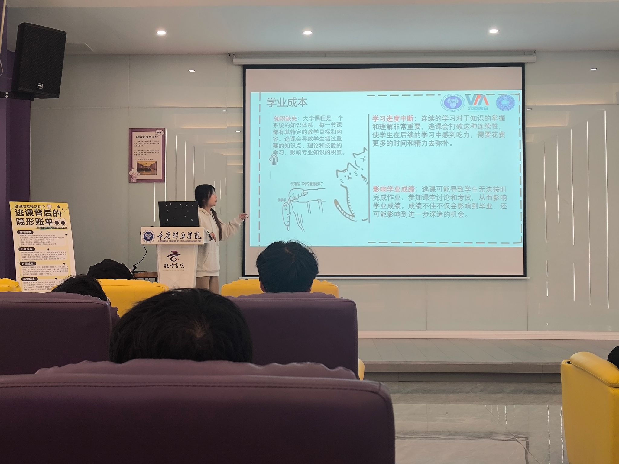 此次活动紧紧围绕“逃课成本引入”、“逃课成本分析”、“呼吁不逃课”三大板块,让同学们深刻认识到逃课这一行为所带来的一系列潜在危害和损失。