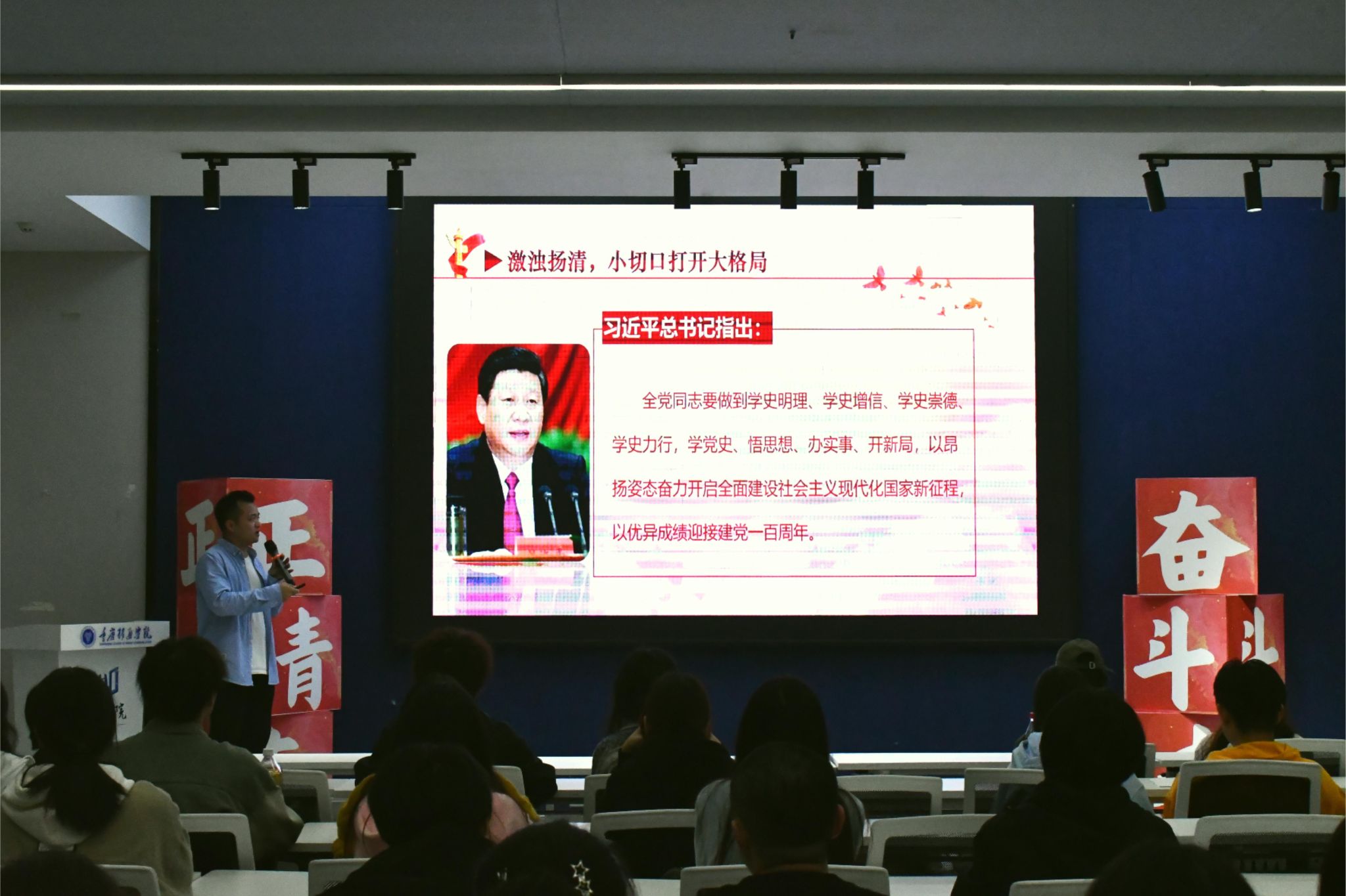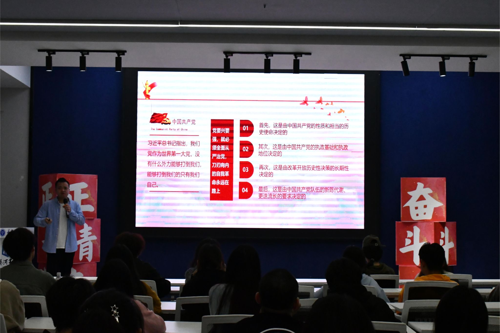 陈安鹏老师向同学们深入阐释了以习近平同志为核心的党中央如何将党的自我革新提升至新的高度。他指出正是通过反腐败斗争,党的建设和革命事业得以推进,强调学习和铭记党史的重要性,倡导将革新精神融入学习生活之中,持续进行自我完善,不断追求进步,正如革命精神的不朽传承。