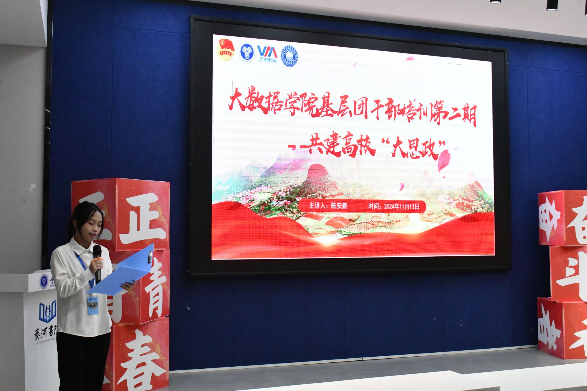 为落实“大思政”教育体系构建的战略部署,全面提升思想政治教育工作的总体水平,致力于培育德智体美劳全面发展的社会主义建设者与接班人,大数据学院于2024年11月13日下午16:20在綦河书院观涛·多功能报告厅举行了以“从百年党史中看中国共产党的自我革命”为主题的基层团干部培训会。本次会议旨在深化团员青年对党的历史与理论的深入理解,提升其政治素养与责任感,为实现中华民族伟大复兴的中国梦贡献青年力量。