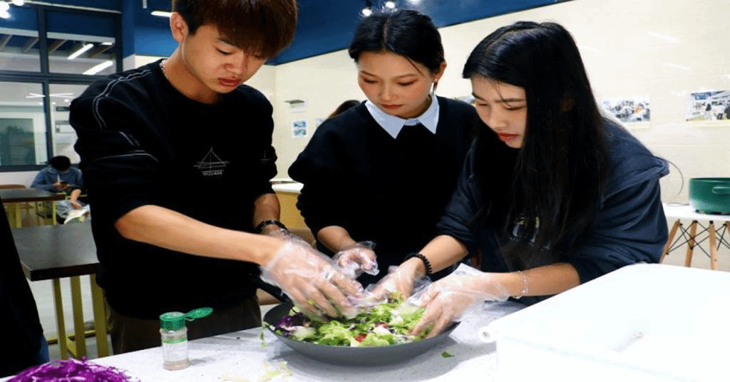 此次活动,不会包饺子的同学试着学习,不会做饭的同学也拿起了厨具,其乐融融。经过老师和同学们两个多小时的共同努力,寿司、沙拉、冰粉、钵钵鸡,还有热气腾腾的饺子装盘上桌,不同食材的碰撞看起来令人垂涎欲滴。同学们亲自动手制作的美食,除了食材本身还加入了耐心和欢喜,成品一出,自豪感也油然而生。