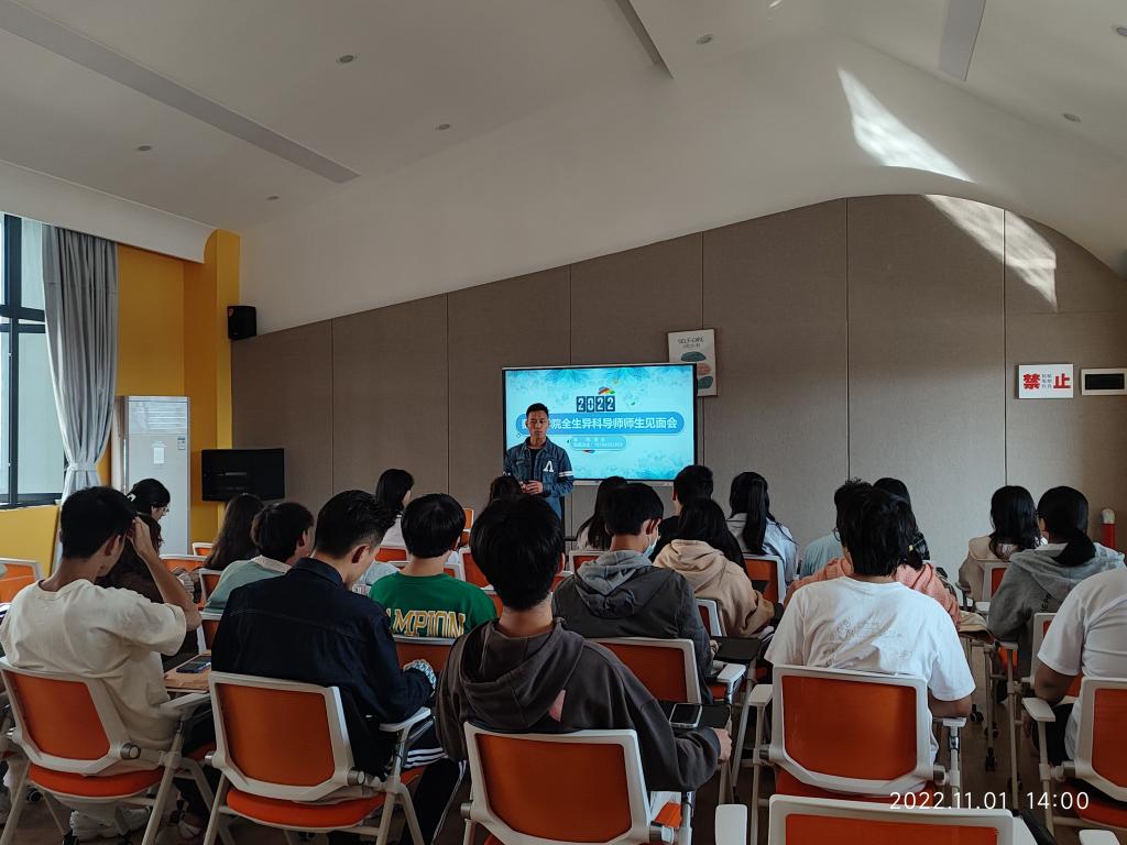 齐相遇,同出发,畅未来。2022年11月01日星期二下午2点在瀛溪书院形而上思辨空间活动室,大数据与计算机科学学院异科导师曹老师与数据科学与大数据技术专业3班、4班的35名同学举行了第一次异科师生见面会。本次活动由曹老师主持,数据科学与大数据技术专业3班、4班的35名同学全体参与,旨在与同学们促了解,共规划,谋发展。