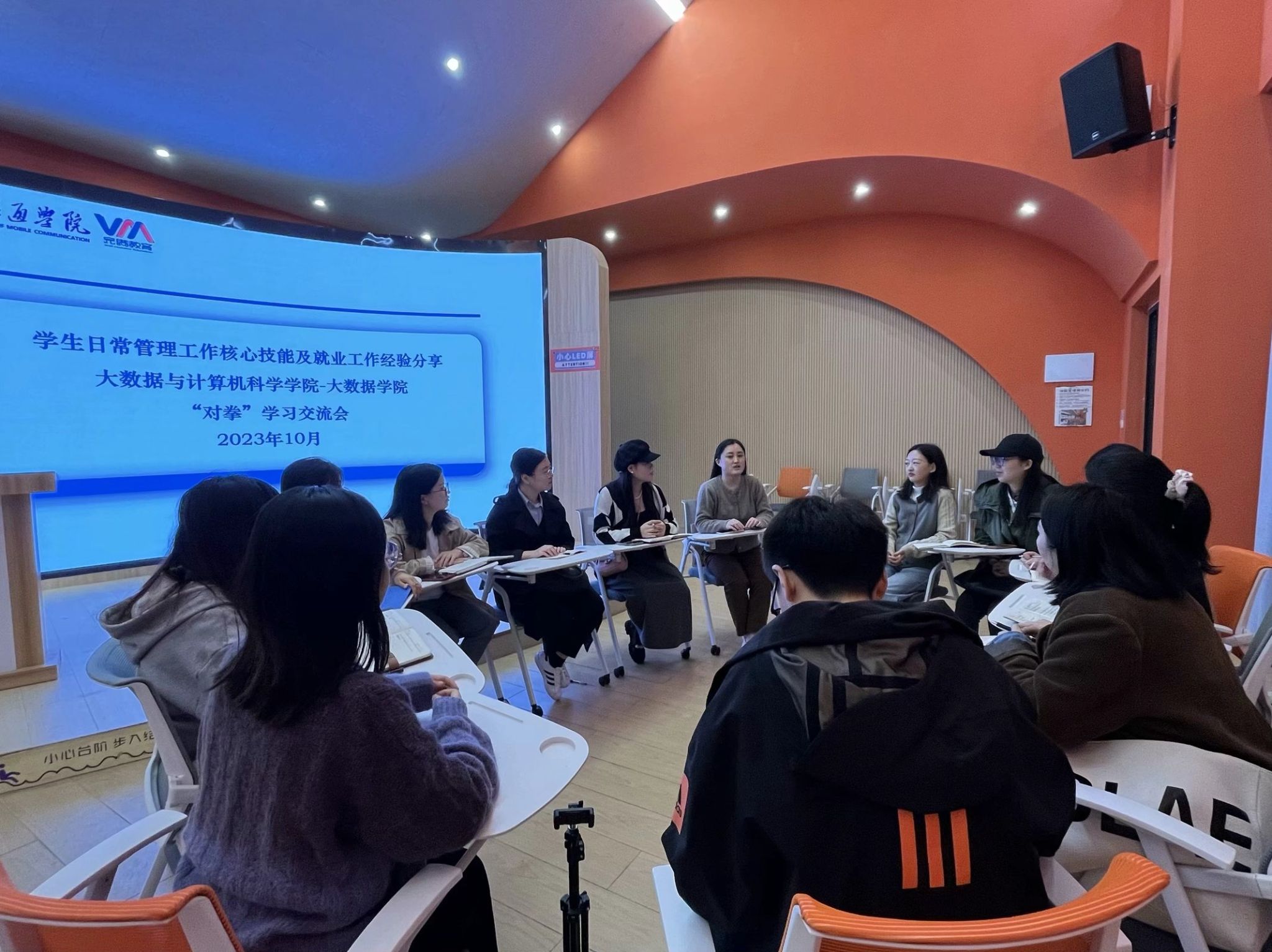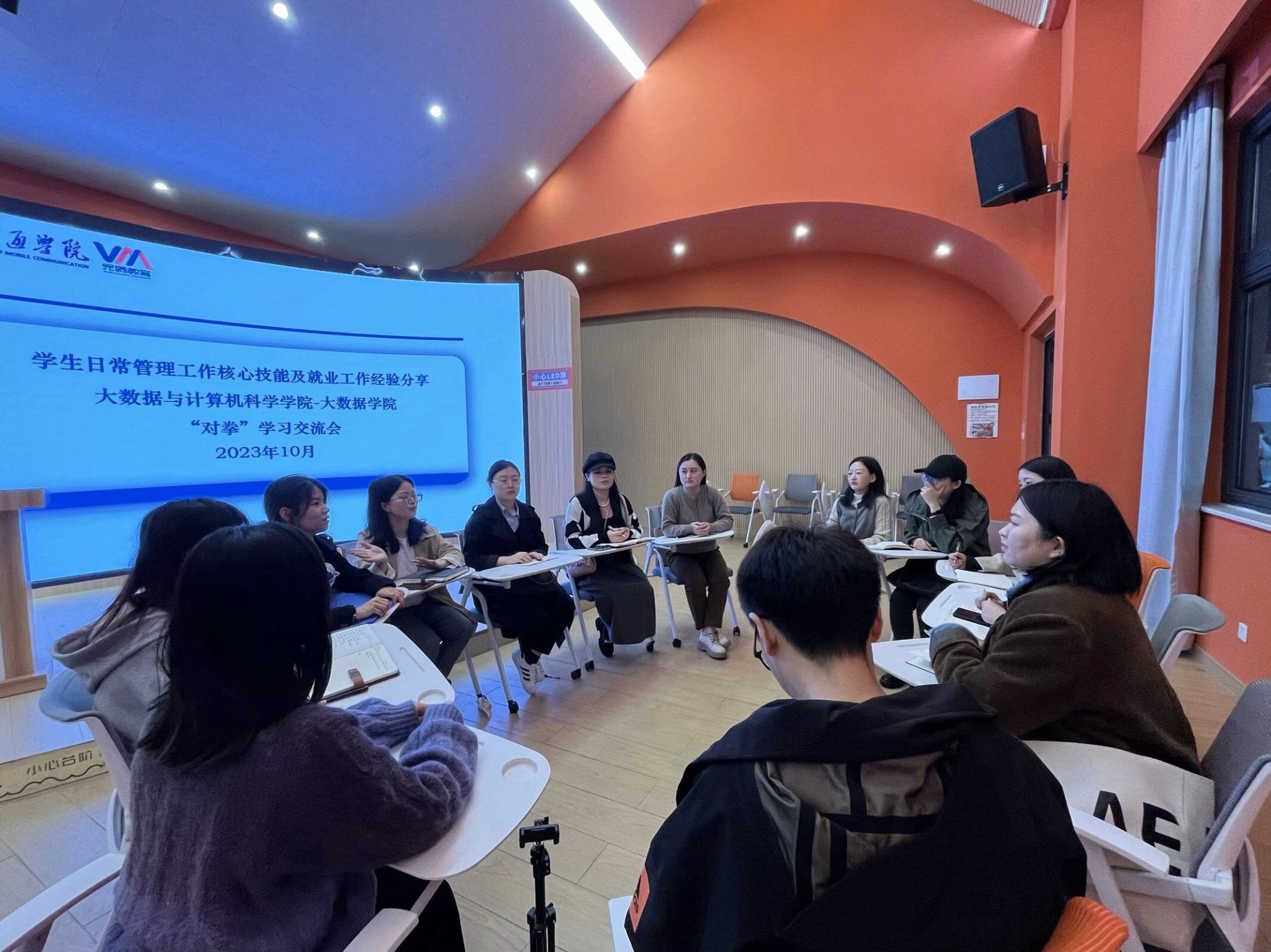 为增进双校区间的交流融合,分享交流学生工作经验,切实提高学生日常管理工作核心技能,2023年10月25日下午18点,大数据学院与大数据与计算机科学学院在古剑书院含光报告厅开展了双校区学院的“对拳”学习交流会,学院学工副院长阙小梅老师、团总支书记兰宇老师、学工办主任李进老师、就业创业办公室主任周义巧老师以及合川校区、綦江校区全体辅导员参加了交流会。