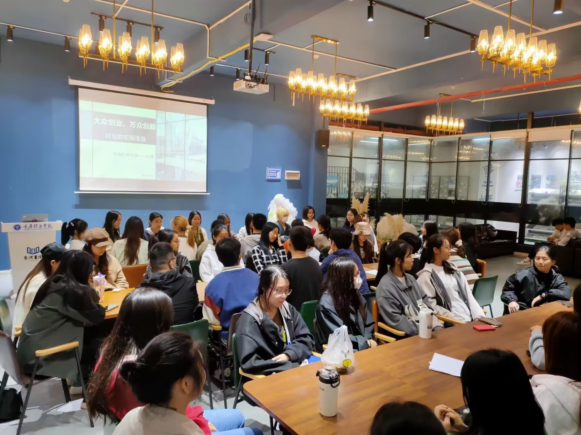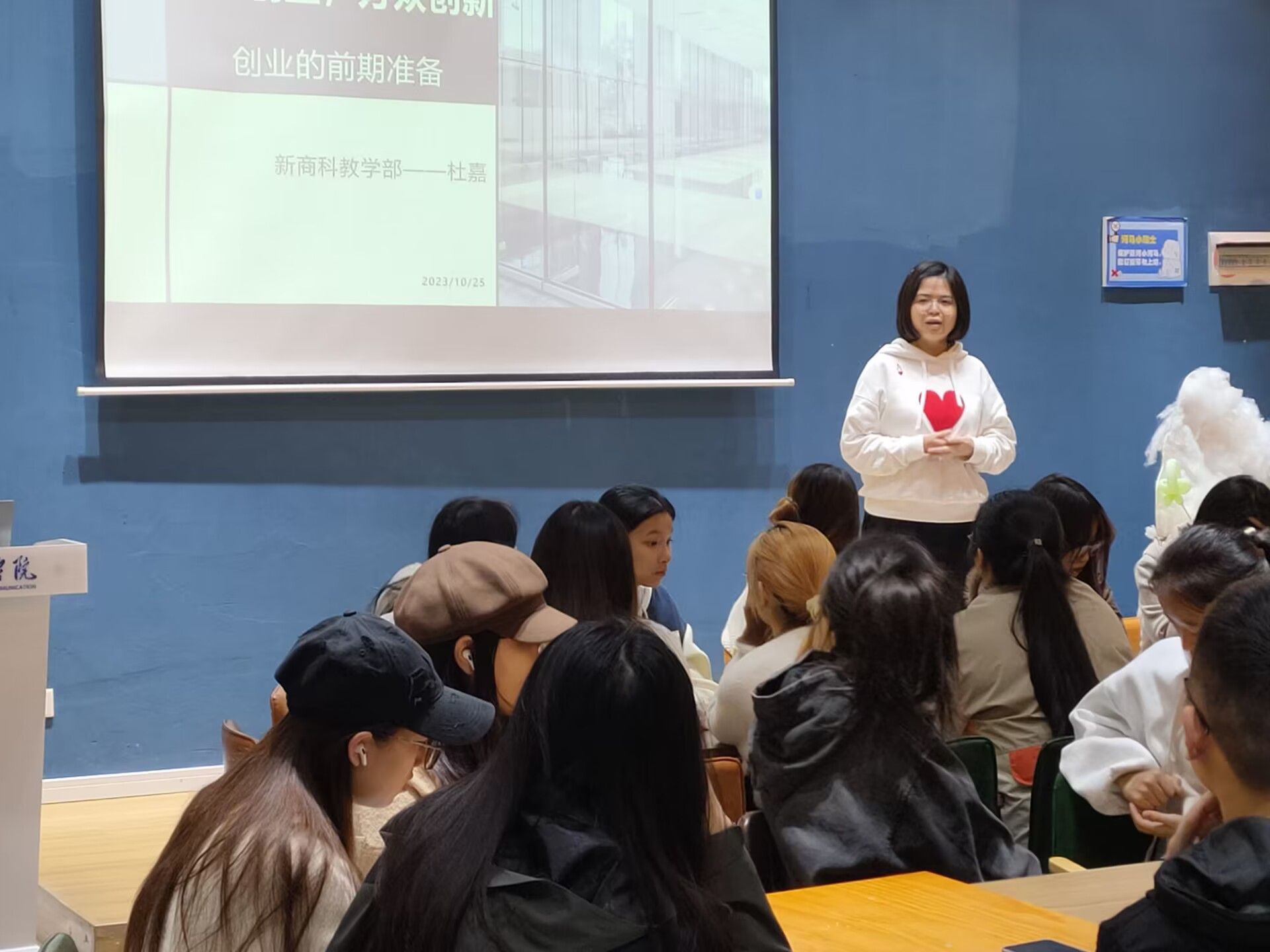 杜嘉老师分享了自己的哥哥在农耕基地创业成功的故事,引起了同学们对创业的兴趣。随后杜老师列举了自己曾经计划加盟经营一家茶百道店铺,却因为各种因素不得不以失败告终的例子,告诫同学们创业常常不是一帆风顺的,切莫因为思想上的冲动而做出不理智的行为。资金、管理和股份划分等问题都是创业前期不可忽视的问题。