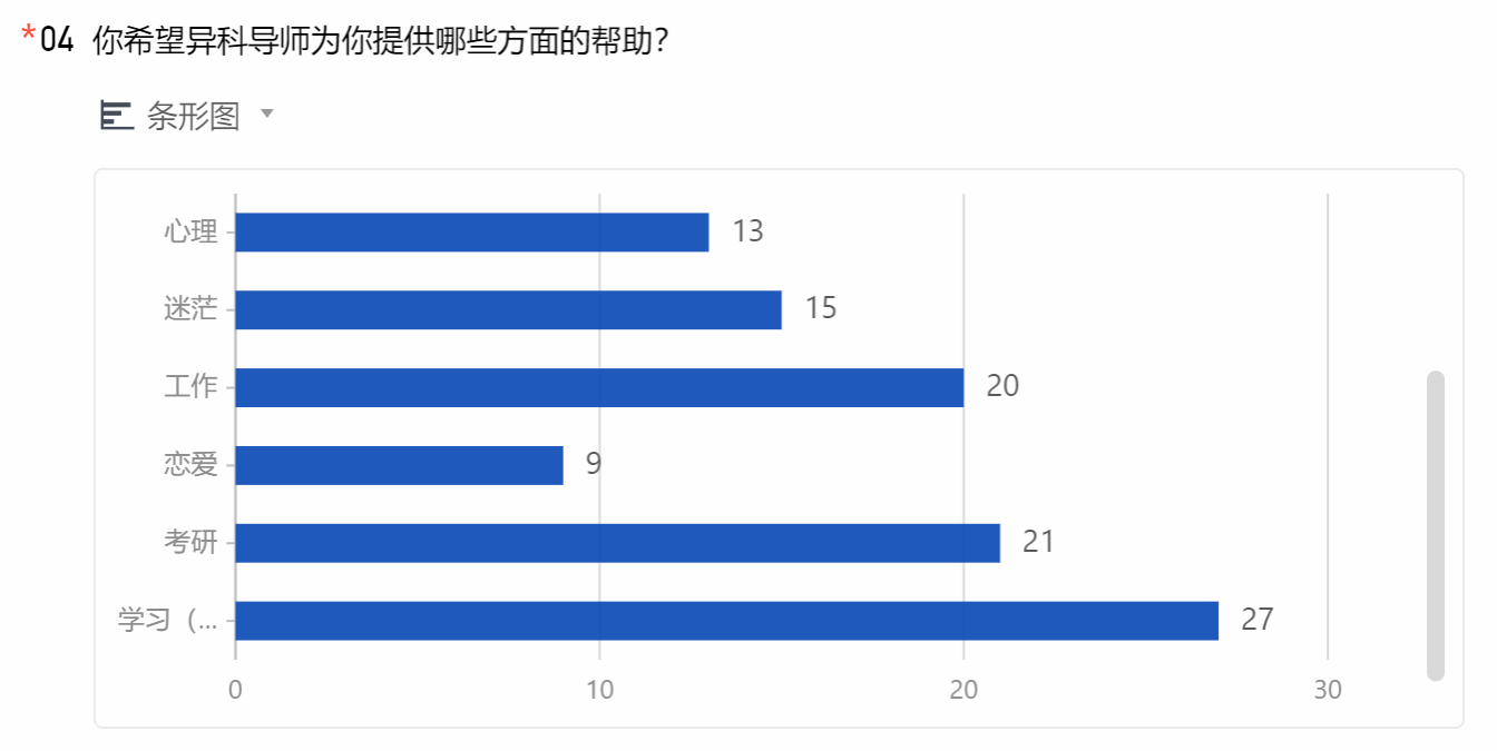 在“你希望异科导师为你提供哪些方面的帮助”问题上,选择最多的是学习方面的帮助,其次还有考研、社交和工作几方面占比较高。通过这份问卷,导师更加具体了解到每位同学的需求以及彼此交往的距离,能够帮助维持良好的关系。