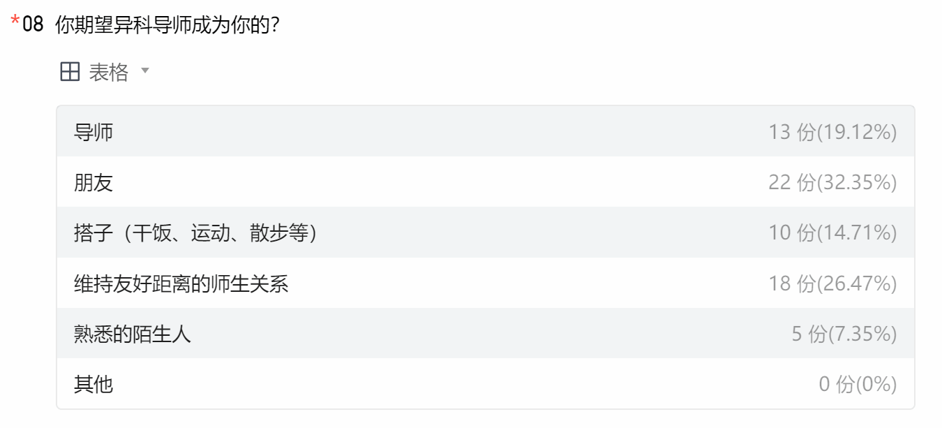 为更好了解同学们的兴趣爱好,以及对异科导师的关系定位,涂老师通过问卷调查做了信息收集。有意思的是,有32%的同学希望跟导师成为朋友,有26%的同学希望跟导师维持友好距离的师生关系,还有5位(7.35%)同学希望导师是熟悉的陌生人。
