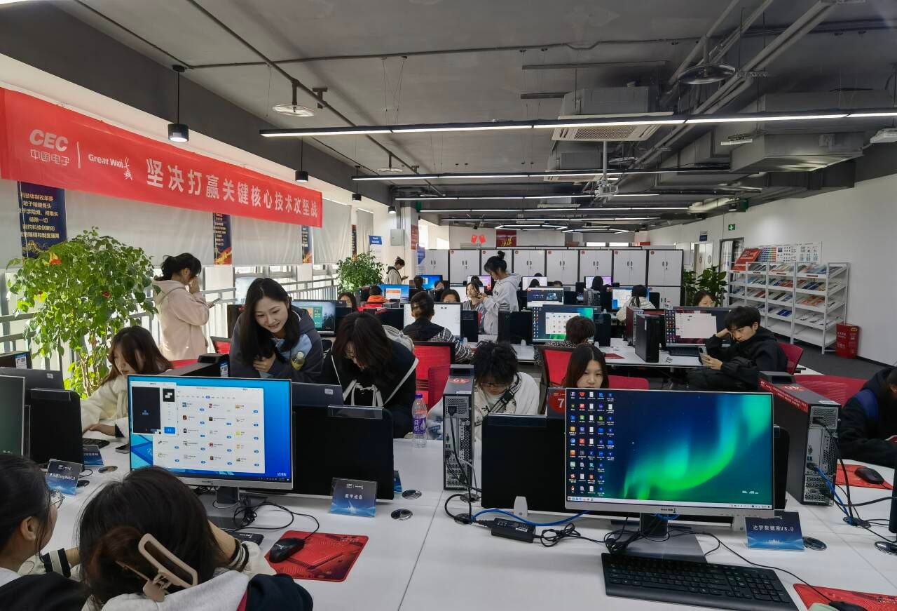 “这是全中国第一台汉化的计算机。”“这是自主研发的最新一代计算机。”跟随讲解工作人员的介绍,大数据学院企业认知实习团来到重庆长城公司产品展厅区和实践展区,进一步细致了解行业历史、成就变迁、产品产出等内容,并坐下身来真切地感受该公司的通用适配区、通用数据中心、研发中心、“1+X”信创实验室等等区域。触摸硬件设施、实地查看设备,切身感受软件系统,同学们查阅企业内部最新资料知识,学习企业行业相关的实用前沿教材,扎到实践平台中去学习。