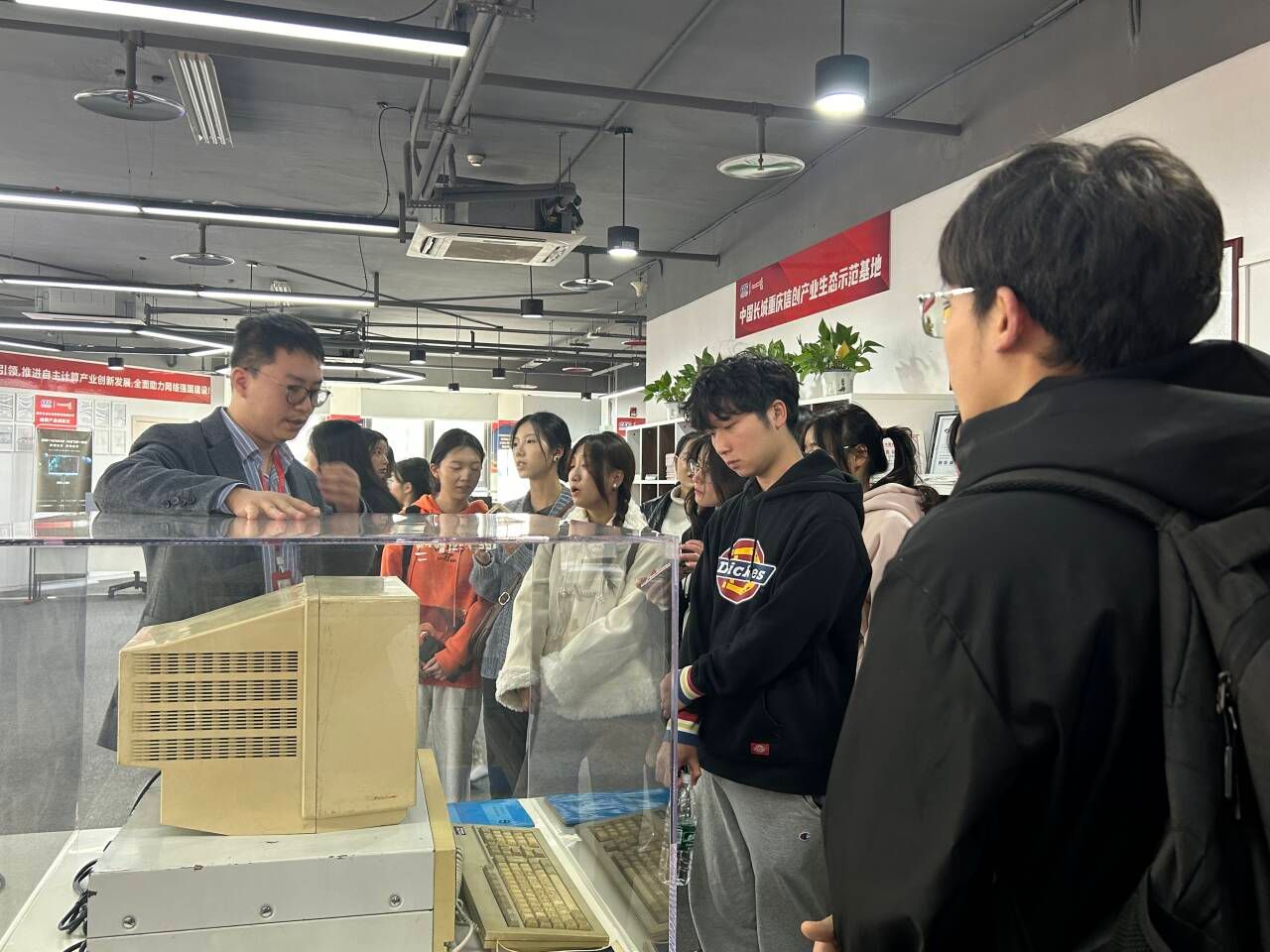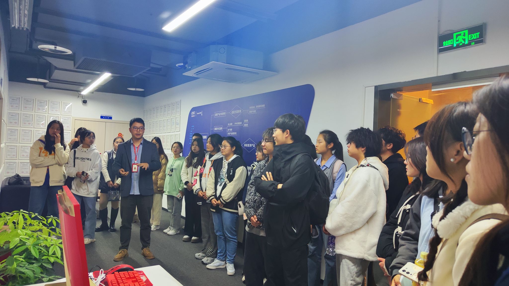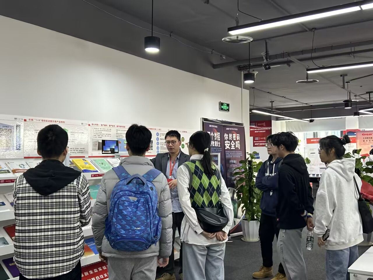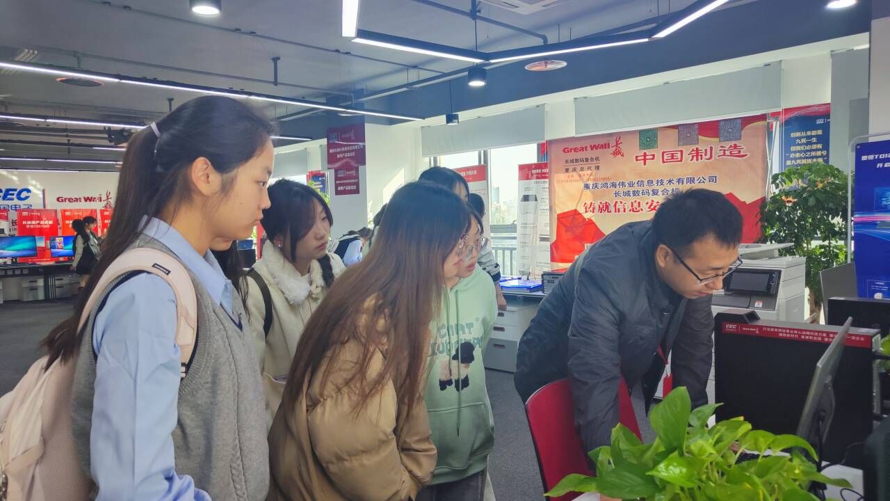 来到重庆长城计算机系统有限公司,同学们在工作人员的带领下了解了公司发展状况和公司架构。作为央企子公司,该公司立足国家战略,追引国家需求,持续聚焦网络安全、信息化、自主高新电子产业,构造起了计算机、互联网络、大数据、IT等领域的完整产品产业生态链。同学们从展厅的宣传栏、宣传手册,学习到了重庆长城在产教融合、校企合作层面的成果和产出,更感受到了学校学院组织此次企业认知实习的深刻用意。