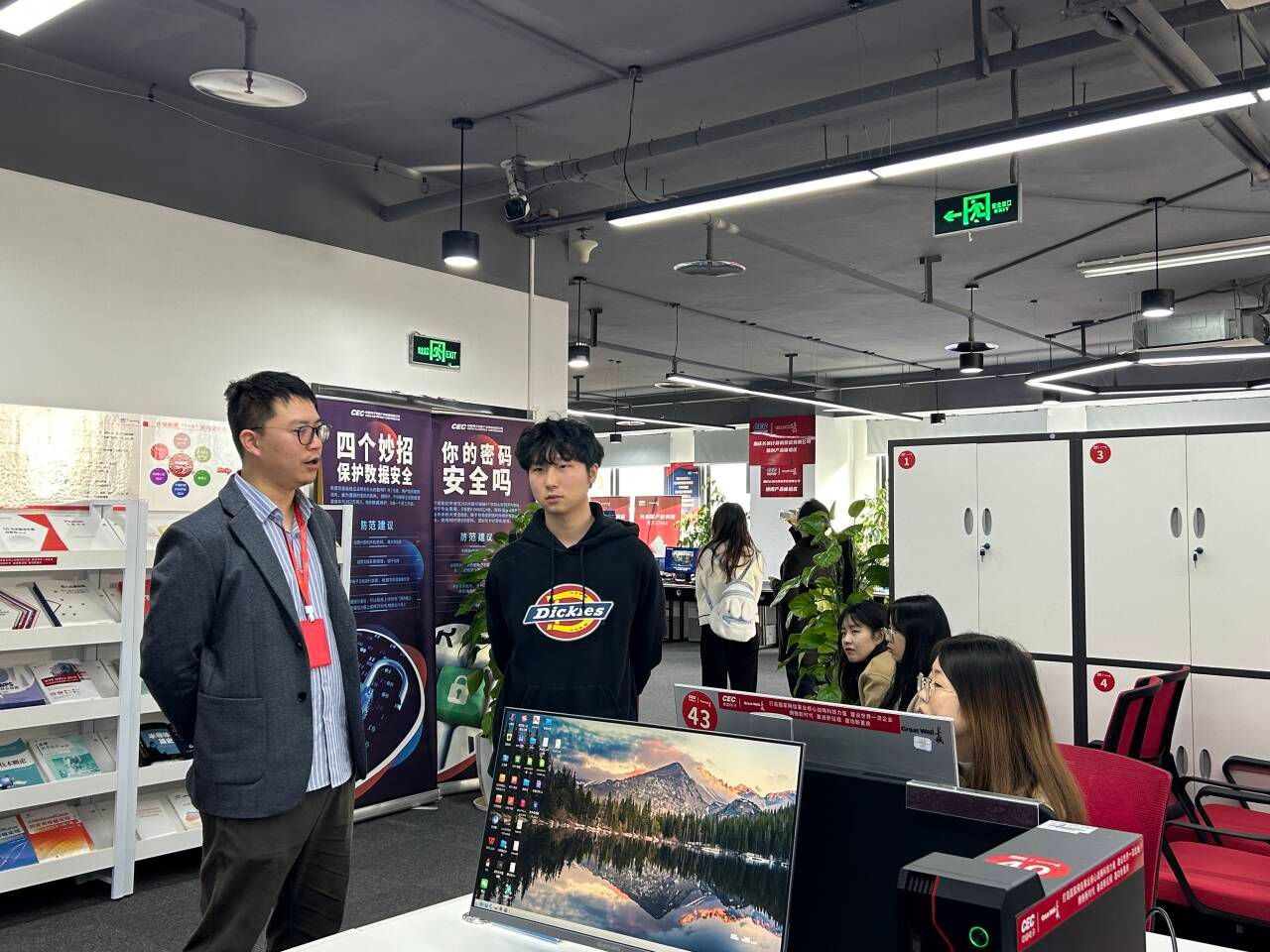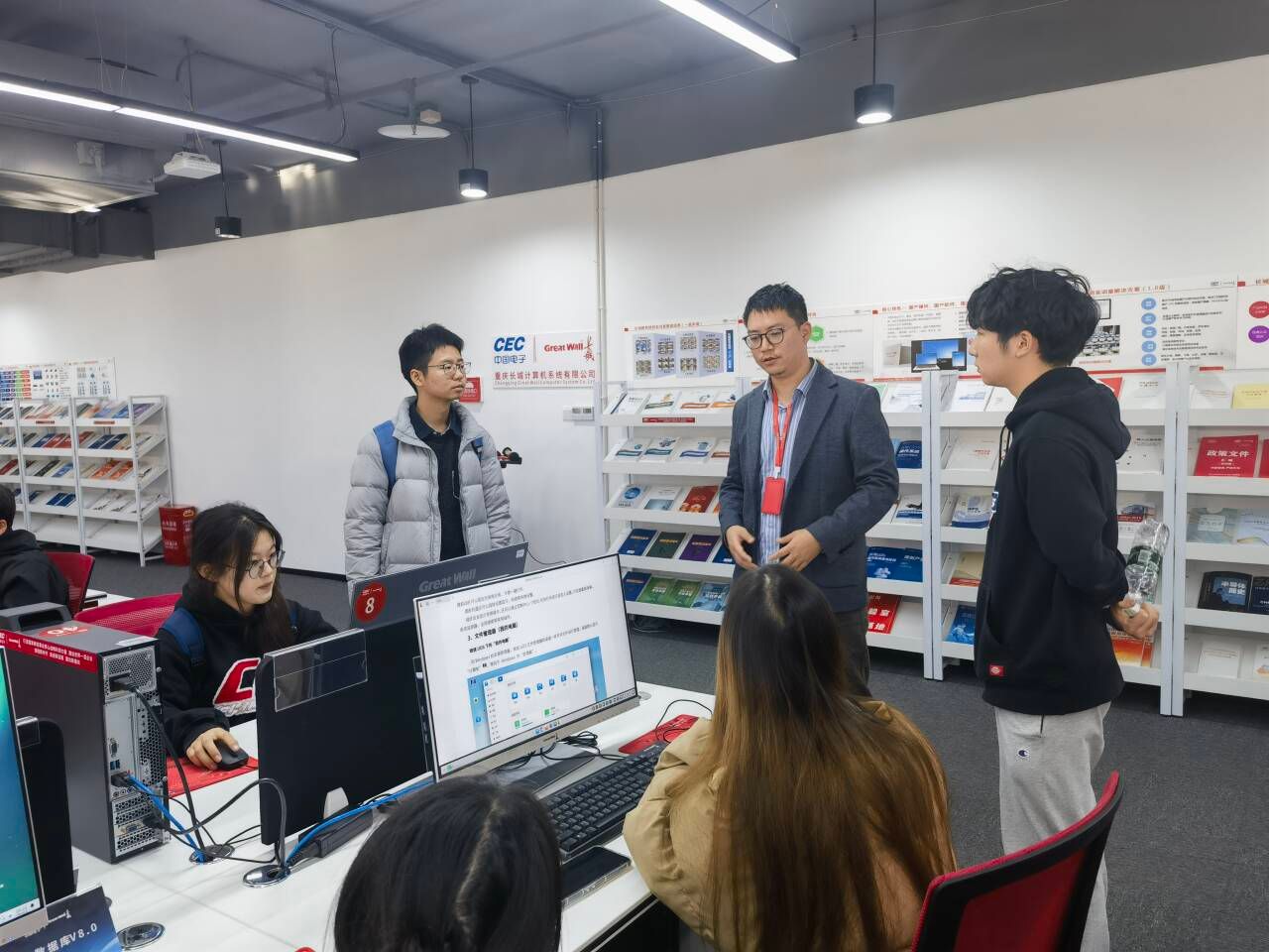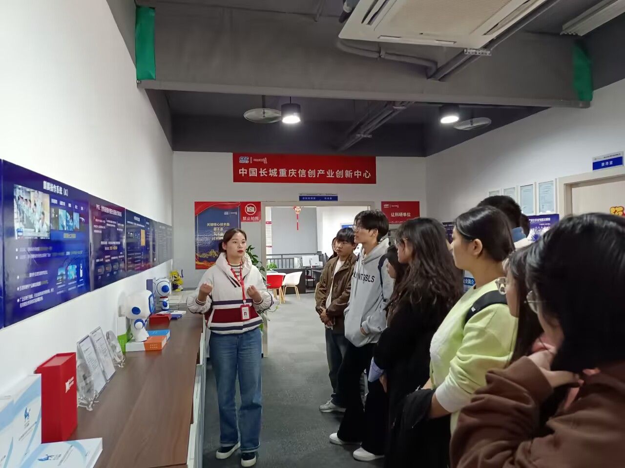 来到重庆长城计算机系统有限公司,同学们在工作人员的带领下了解了公司发展状况和公司架构。作为央企子公司,该公司立足国家战略,追引国家需求,持续聚焦网络安全、信息化、自主高新电子产业,构造起了计算机、互联网络、大数据、IT等领域的完整产品产业生态链。同学们从展厅的宣传栏、宣传手册,学习到了重庆长城在产教融合、校企合作层面的成果和产出,更感受到了学校学院组织此次企业认知实习的深刻用意。
