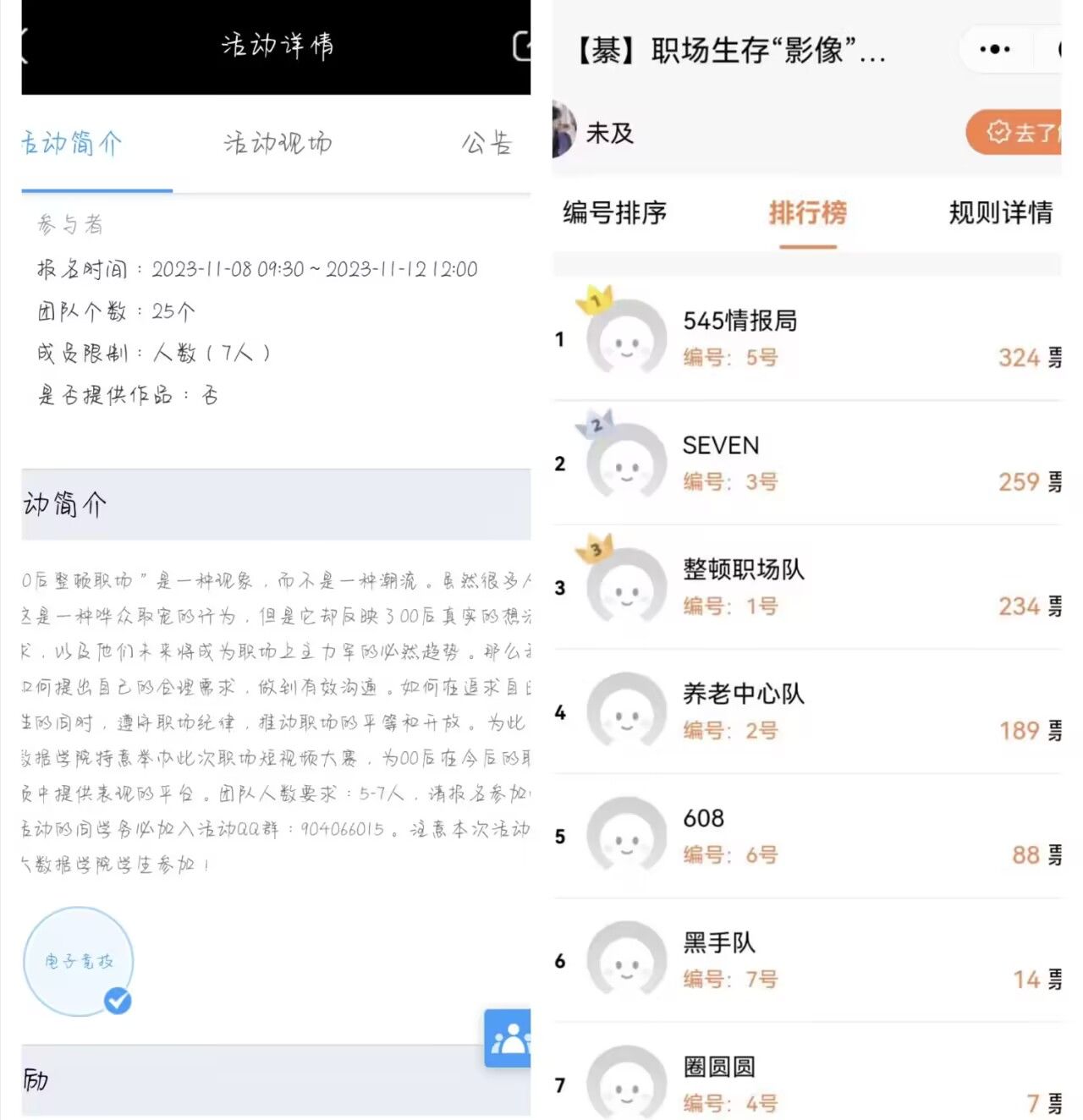 职场是个充满挑战和机遇的大熔炉,既可以提供我们所需要的技能、经验以及发展机会。此次活动主要面向大数据学院全体同学,通过线上视频征集初赛以及线下颁奖决赛的模式进行。线上主要以5-7人进行团队组建并在悠学派进行报名参赛,初赛期间,参赛人员将作品在规定时间内发至相关邮箱后,经由主席团、干部以及老师进行投票,筛选出入围决赛的作品。