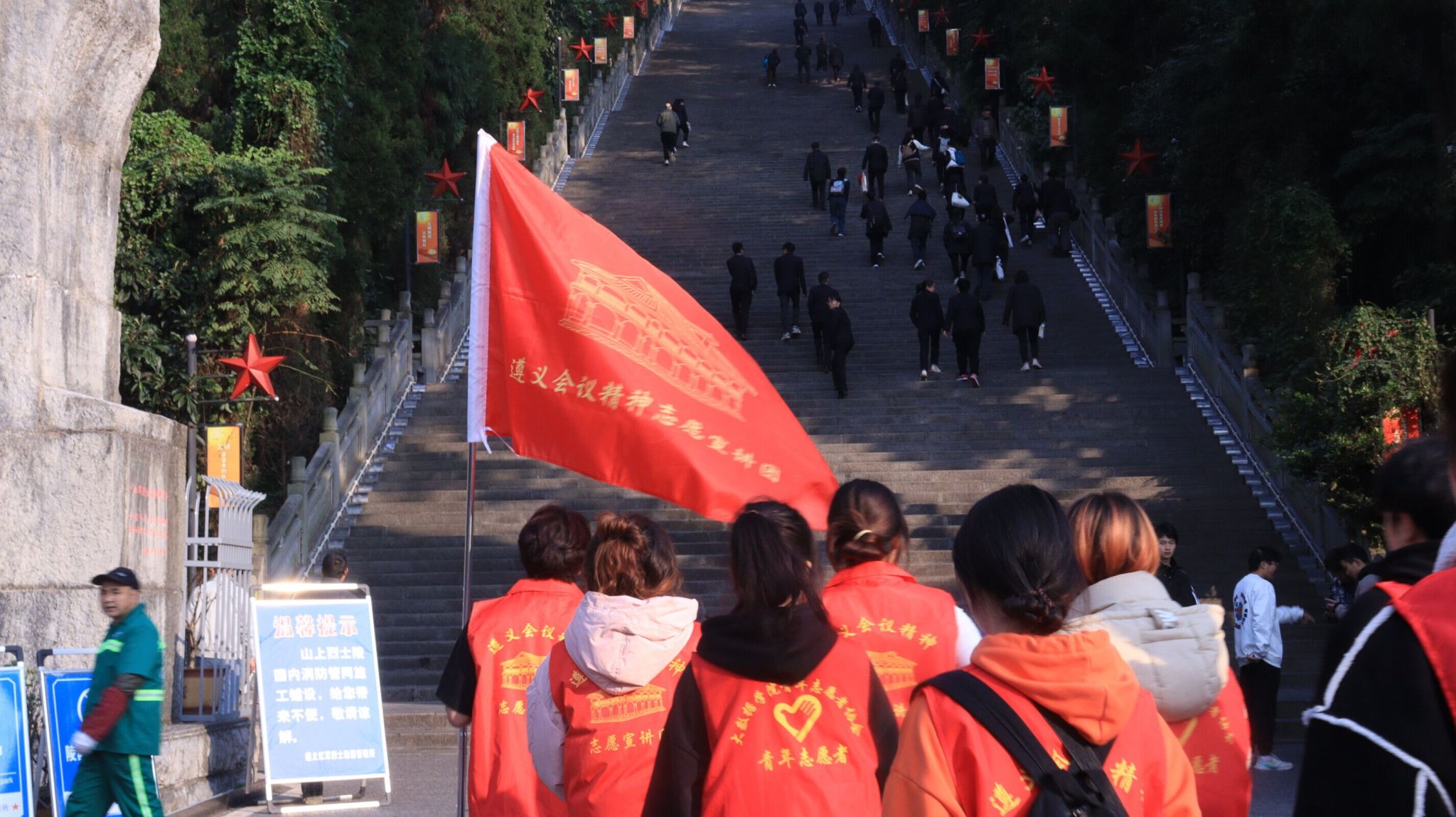 走进一首词,走进一段历史。忆一抹红色峥嵘,延一份精神长流,一段路程展现中华民族抗战的艰辛岁月,一段历史镌刻红色记忆中的动人凯歌。团队成员来到娄山关景区,瞻仰先人事迹,感受红军长征的艰苦卓绝和壮丽辉煌。沿着坡路而上,“娄山关”三个大字映入眼帘,字体为颜体行书,刚劲有力,字径2.3米,由原中国书法家协会主席,老红军舒同于1984年题字。长空桥,桥长一百米,宽5米, 离地面约60米,长空云扬,铁索连桥,桥上可纵观娄山全景,重走长征路,感受烽火岁月的革命精神。沿着百仗梯而下,参观娄山关战斗遗址陈列馆,了解红色故事。
