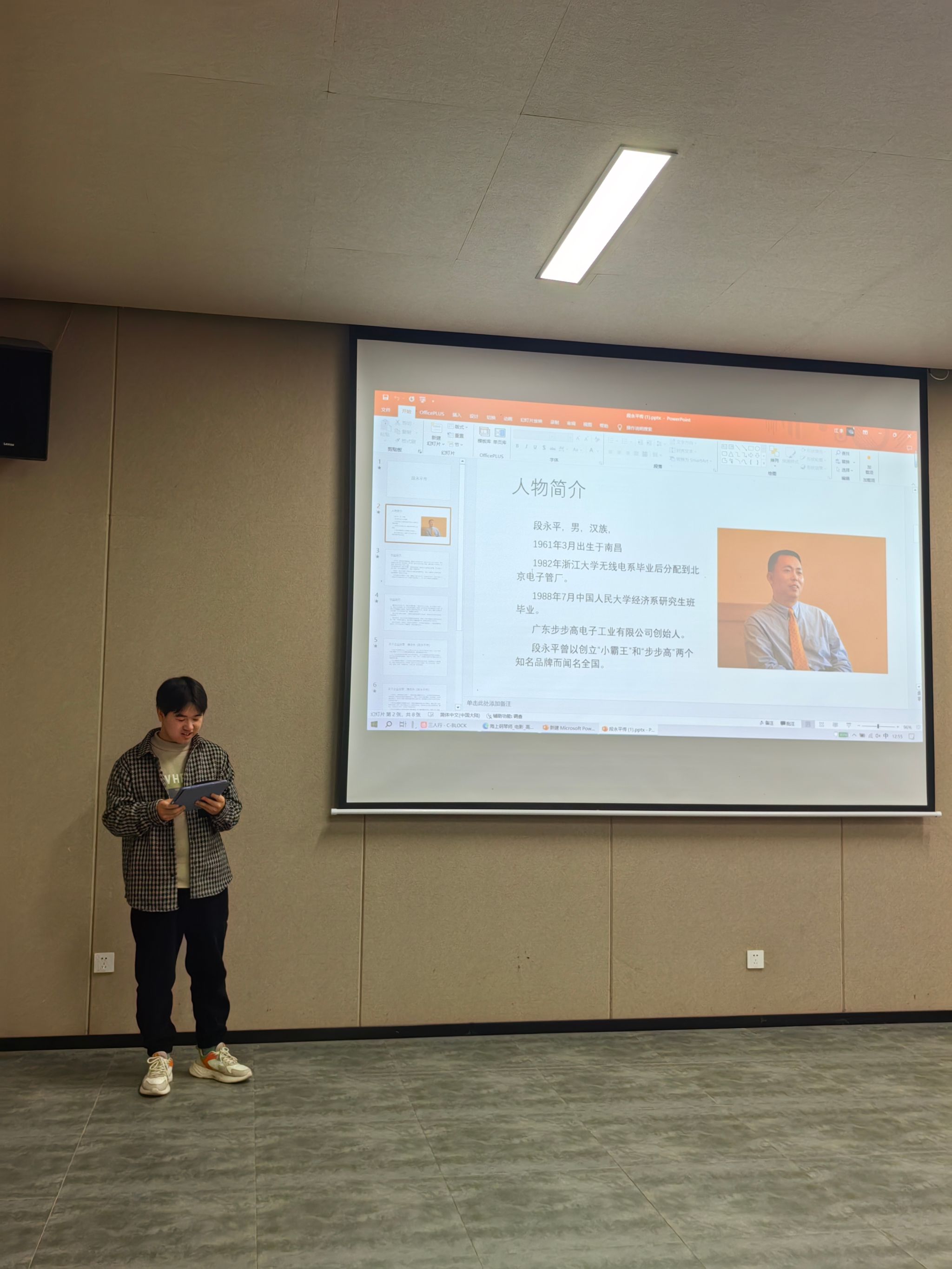 接下来,师生进行了精彩的阅读分享。王朝铃同学是本次分享会的第一个领读人,他阅读《段永平传》后,从人物生平、创业经历、投资理念以及个人魅力4个部分进行分享。首先介绍了雷军的生平履历及创业经历,讲述了他从打工到管理,再到投资家、创业家的职场历程。通过故事解读、总结和阐释,向我们展示了他在企业中实行“本分”、“平常心”等管理哲学,注重培养团队的合作和信任,使得企业能够高效运转并取得良好的业绩。这些管理经验不仅适用于企业界,也适用于个人管理、团队建设等方面。其次,王同学提到,段永平始终保持着谦逊和真诚的态度,强调“本分”和“平常心”,并以此作为自己的管理哲学和处世之道。这种哲学和态度不仅在企业管理中有着重要的意义,也对我们每个人的日常生活有着积极的启示。最后,王同学还总结了段永平的投资理念:段永平的投资风格是长期主义(以十年为维度进行思考)+满仓主义(不惧牛熊大多数情况下满仓持有)+集中投资(能看懂的好生意只有三四个)。