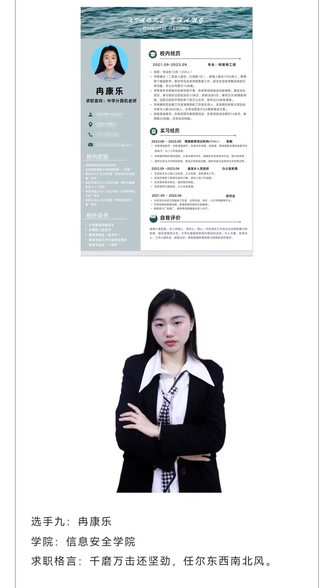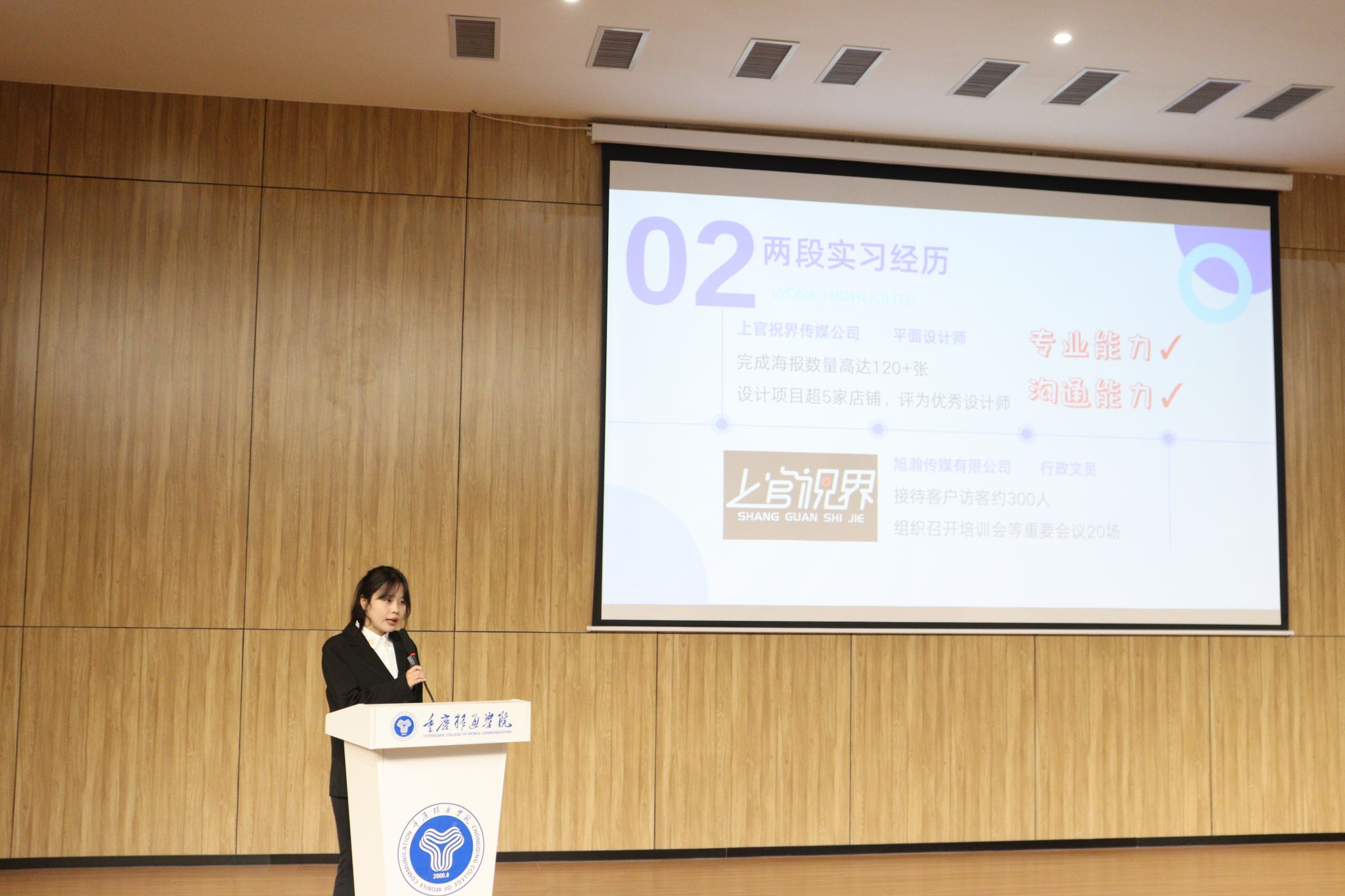 在决赛过程中,18位选手各显神通、异彩纷呈、酣畅淋漓。来自数字经济与信息管理学院的张云杰同学,以极具个性的VCR向各位评委老师和同学们阐述他所想应聘的说唱导师职位优势与特长;“从大山中走来,投入西部计划中去”来自大数据学院的郭小容同学,她希望投身于祖国的西部建设中去,为祖国的发展建设贡献智慧力量……新媒体运营、UI设计、说唱歌手、中学教师岗位,各位选手的决赛简历作品极具创意与新颖,简历内容充实、求职目标明确,突出优势明显,代表着同学们对未来求职就业的充分认识。