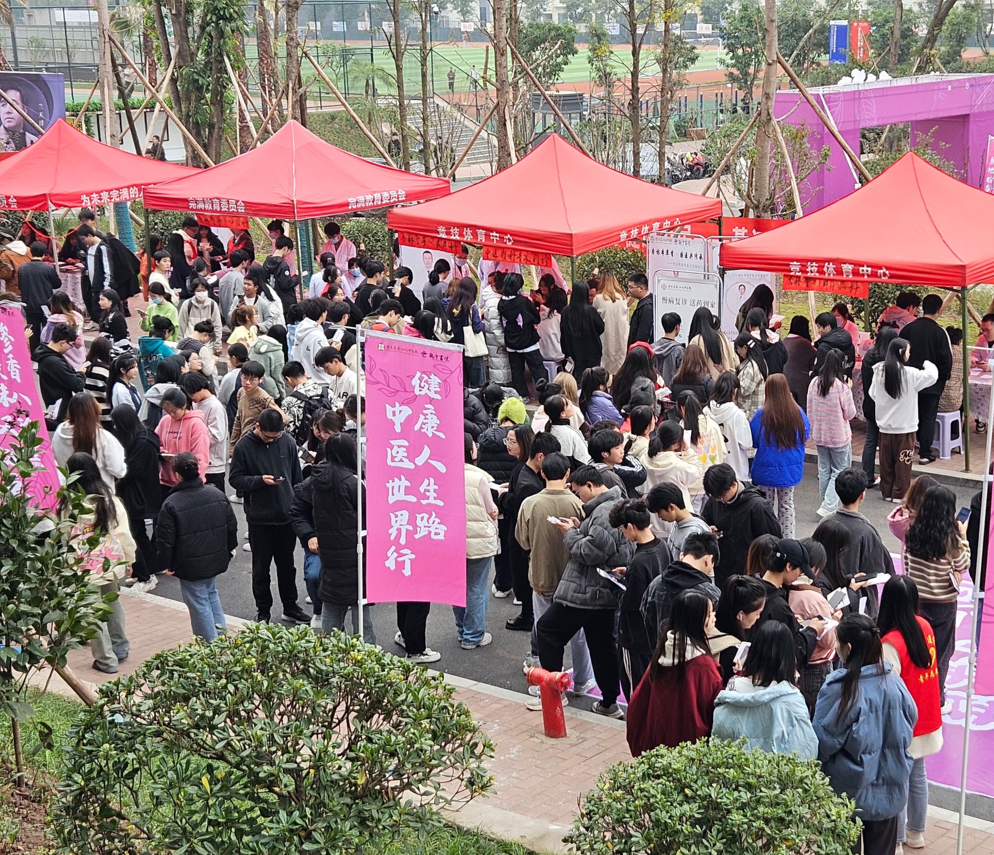 本次活动场地内设置药材展示、医具讲解、食铺品尝等多个区域。同学们热情极高,整体参与人数高达3000余人。现场氛围热闹非凡、人潮涌动,大家争相体验多种特色活动,沉浸式感受中医药文化的底蕴与魅力。