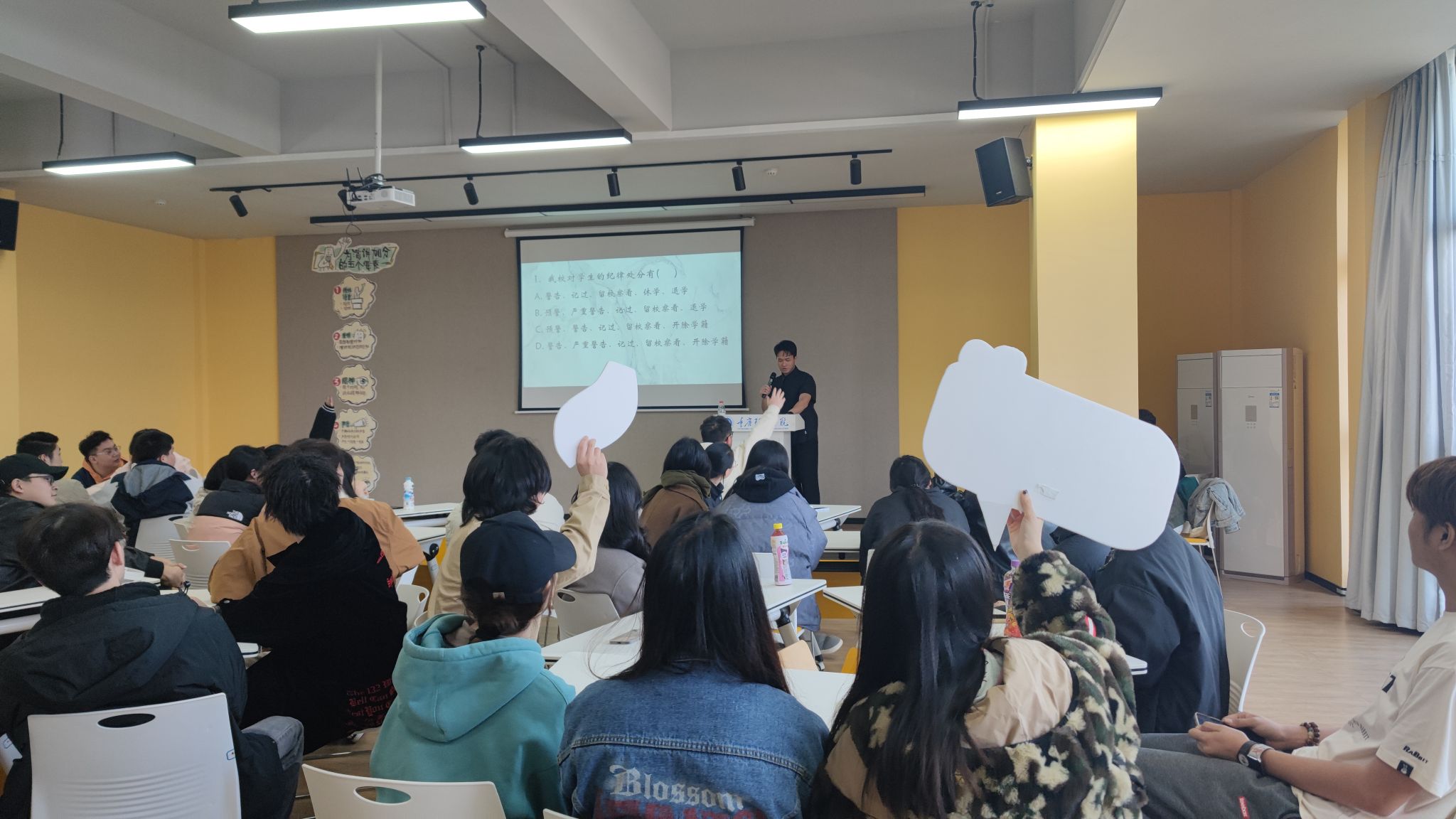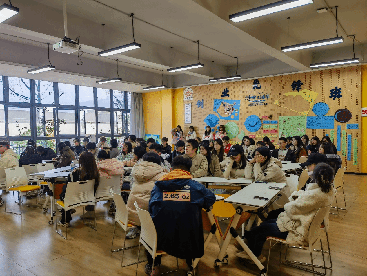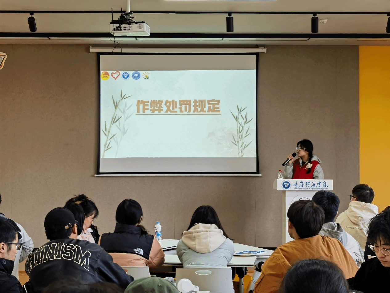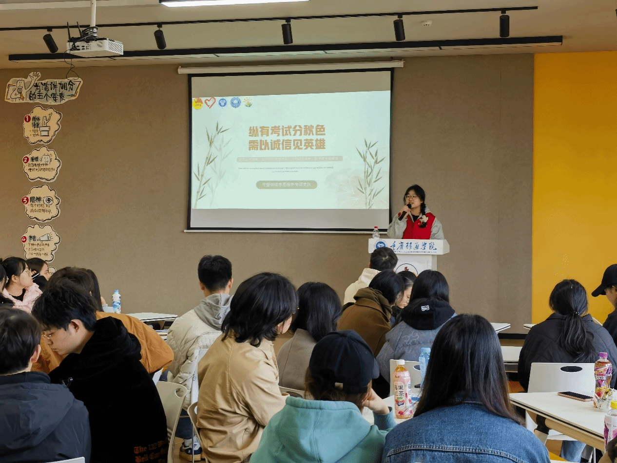 首先由守望诚信志愿服务专项支队从诚信考试的重要性、考试中的违纪行为、作弊处罚规定以及如何诚信考试四个方面进行了宣讲;其次,由班会主持人采取积分竞答的方式,与同学们进行有关学风建设的互动,巩固宣讲获取的知识。