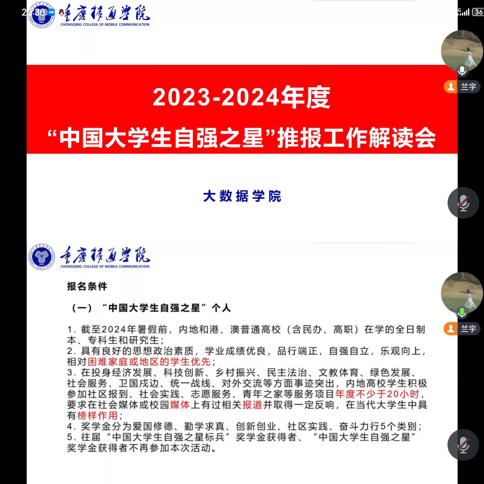 2024年2月17日下午15:00,大数据学院通过腾讯会议开展了线上答辩会。学院副院长阙小梅老师和全体辅导员出席答辩会并担任评委老师。评委们根据答辩者所提交的报名表和佐证材料,以及现场答辩进行打分。