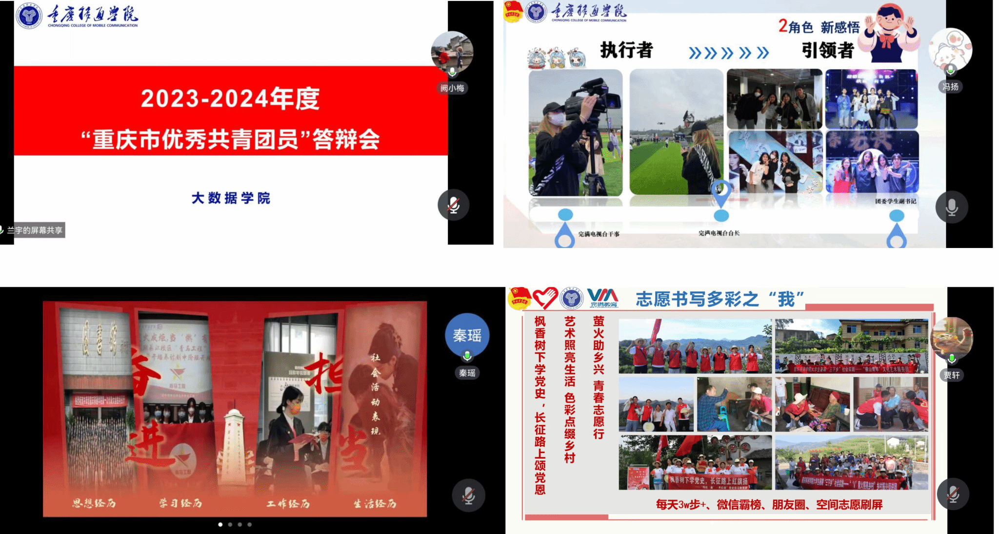答辩过程中,全体报名同学依次参与汇报,答辩的同学精心对待,认真准备,纷纷对自己的在校期间的学习及工作进行了介绍,分享了在参与完满教育,如社团活动、志愿工作中的所获荣誉,充分展现出积极奋进,昂扬向上的青春姿态。从同学们的答辩内容中看,他们当中有学习成绩优异的同学,也有热爱公益服务的志愿者、有淬炼青春的班团或组织干部、有服务基层家乡的青年学子,不管是何身份、做哪份工作,他们都勇于奉献,充分展现了新时代大学生的精神风貌。