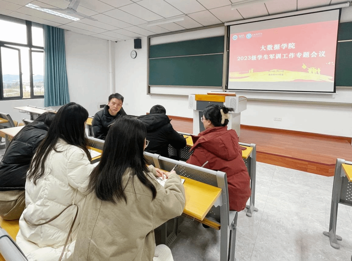 在2024年2月23日,大数据学院根据学校2023级学生军训工作要求和安排,在勤者楼403教室召开了军训工作专题会议,大数据学院副院长阙小梅老师、学工办主任李进老师和学院全体辅导员在会上,细化落实相关工作任务,强调各类注意事项,确保即将到来的军训工作平稳、有序地顺利进行。