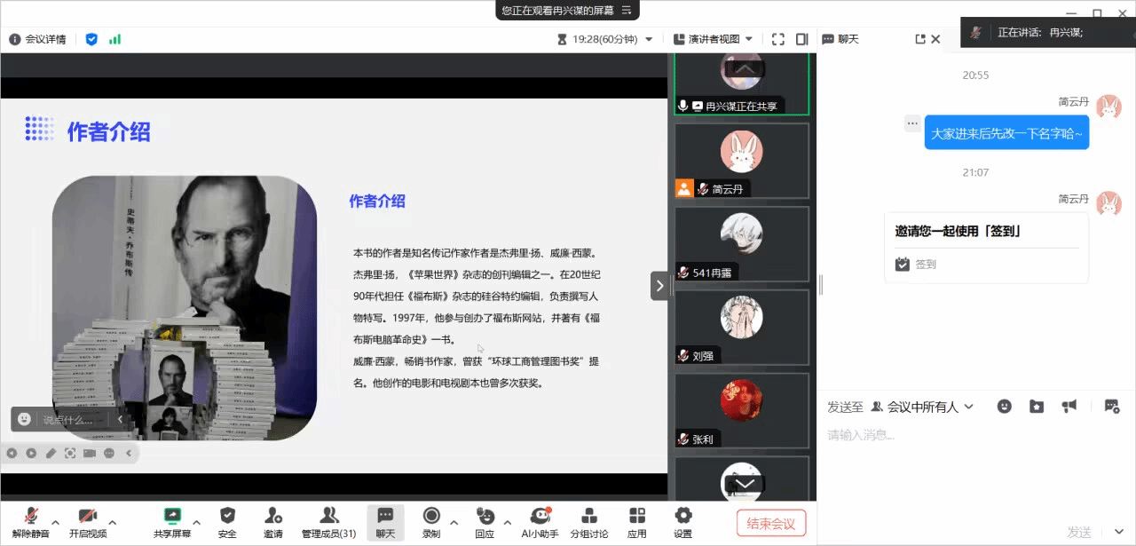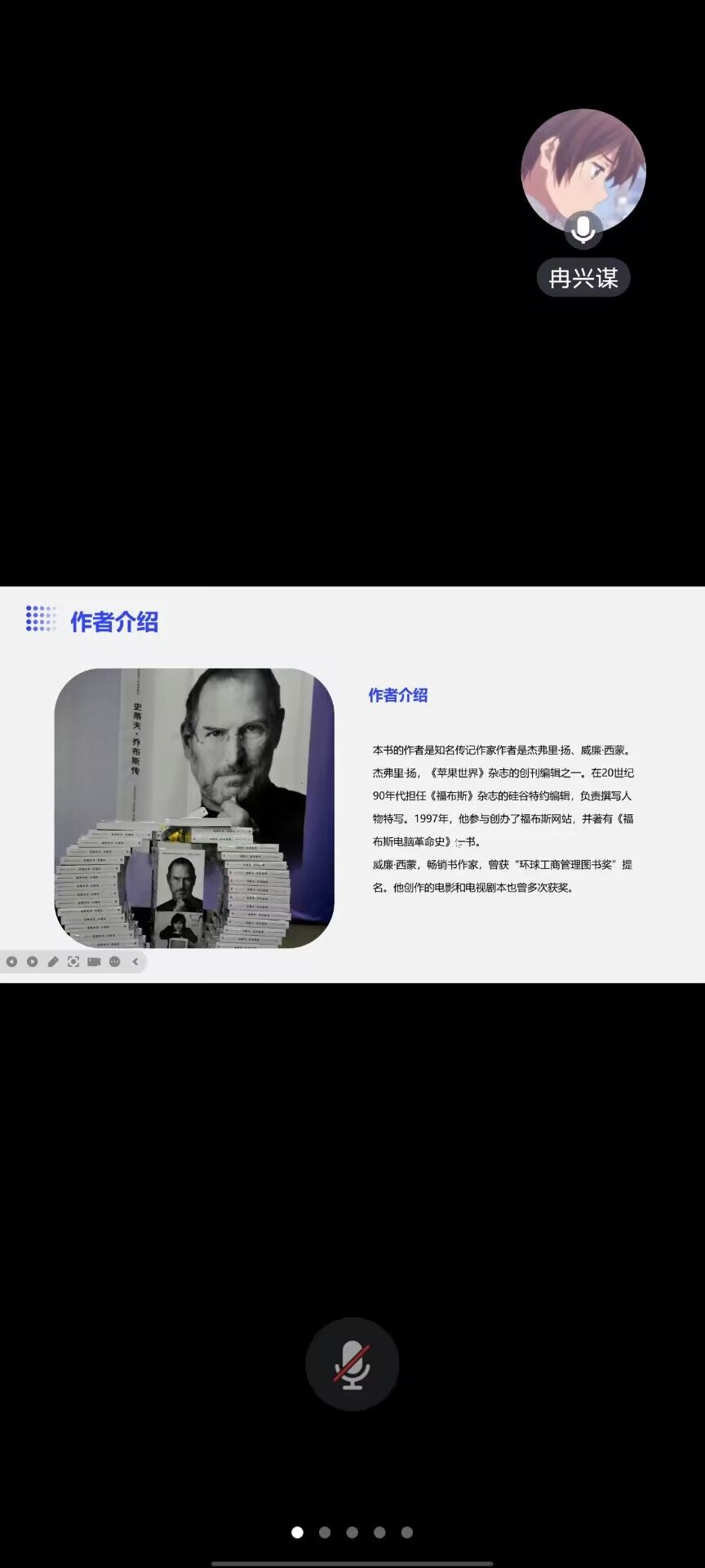 冉兴谋同学分享了《活着就为改变世界:史蒂夫•乔布斯传》,先对作者进行了介绍,本书的作者有两个,分别是杰弗里·扬和威廉·西蒙。杰弗里·扬,《苹果世界》杂志的创刊编辑之一。在20世纪90年代担任《福布斯》杂志的硅谷特约编辑,负责撰写人物特写。1997年,他参与创办了福布斯网站,并著有《福布斯电脑革命史》一书。威廉·西蒙,畅销书作家,曾获“环球工商管理图书奖”提名。他创作的电影和电视剧本也曾多次获奖。