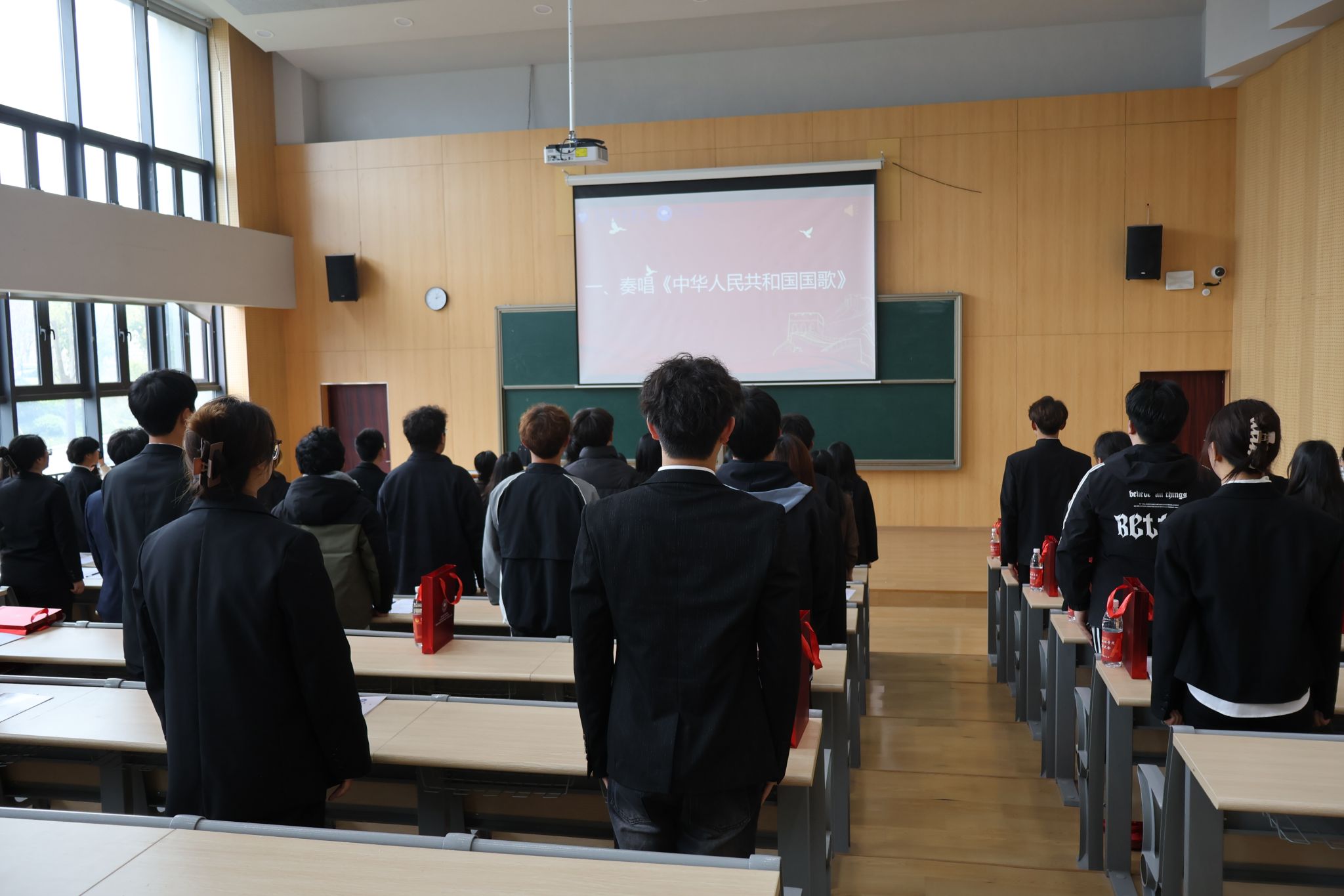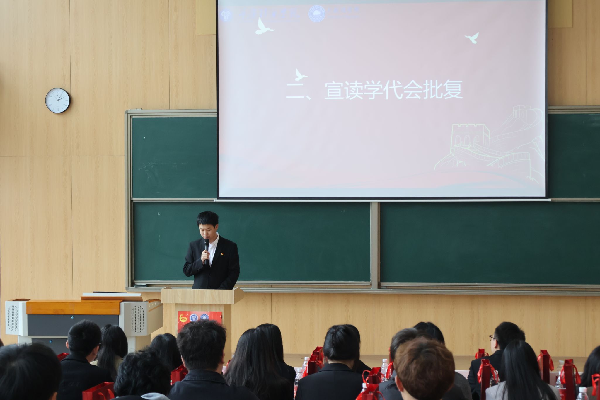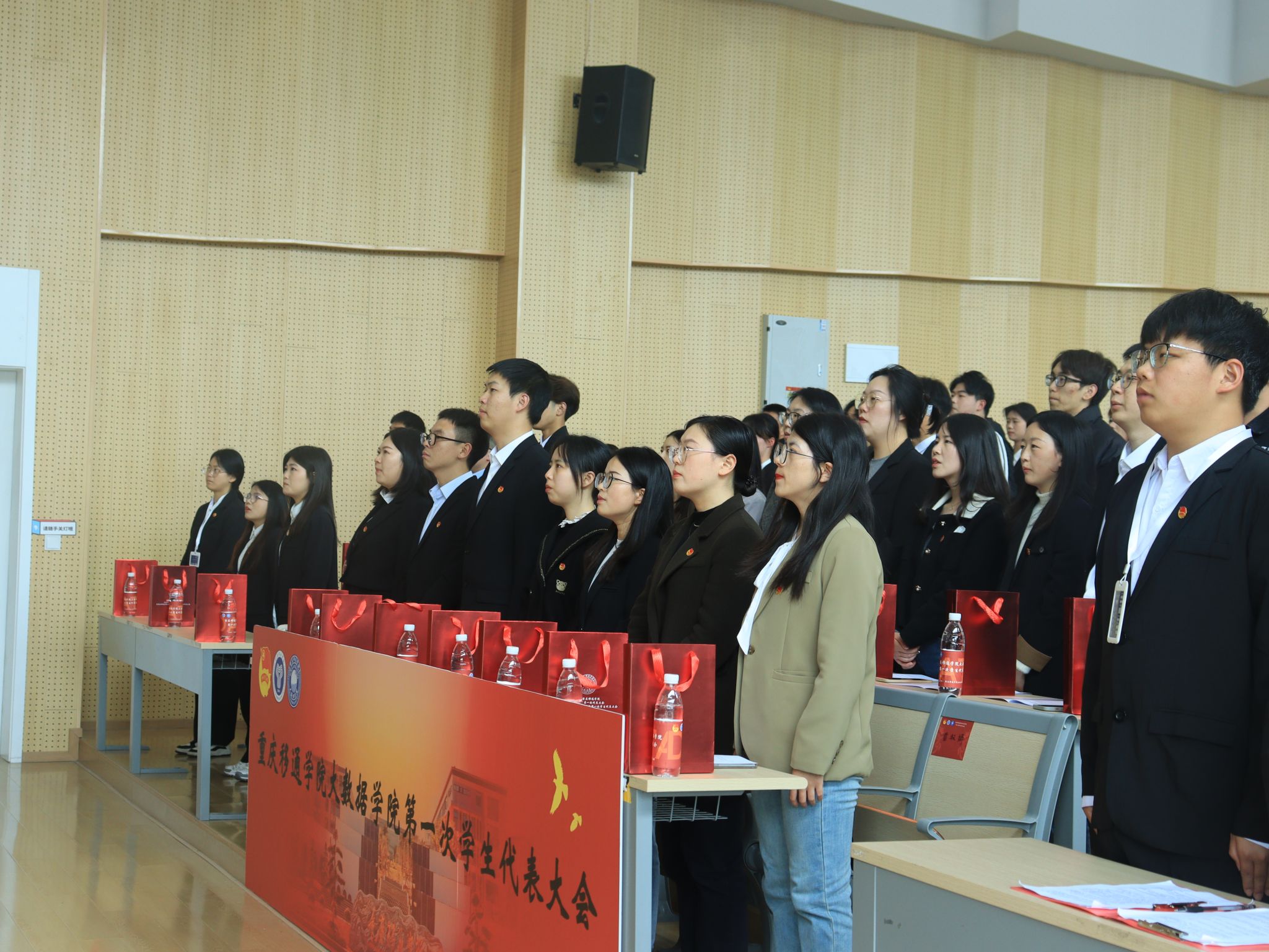伴随着庄严的国歌声,全体参会人员起立神情肃穆,齐声唱起国歌,也代表着此次学代会正式开始。校团委学生会指导老师钟玉寒宣读了《关于同意召开重庆移通学院大数据学院第一次学生代表大会的批复》,并向此次大会召开表示祝贺。