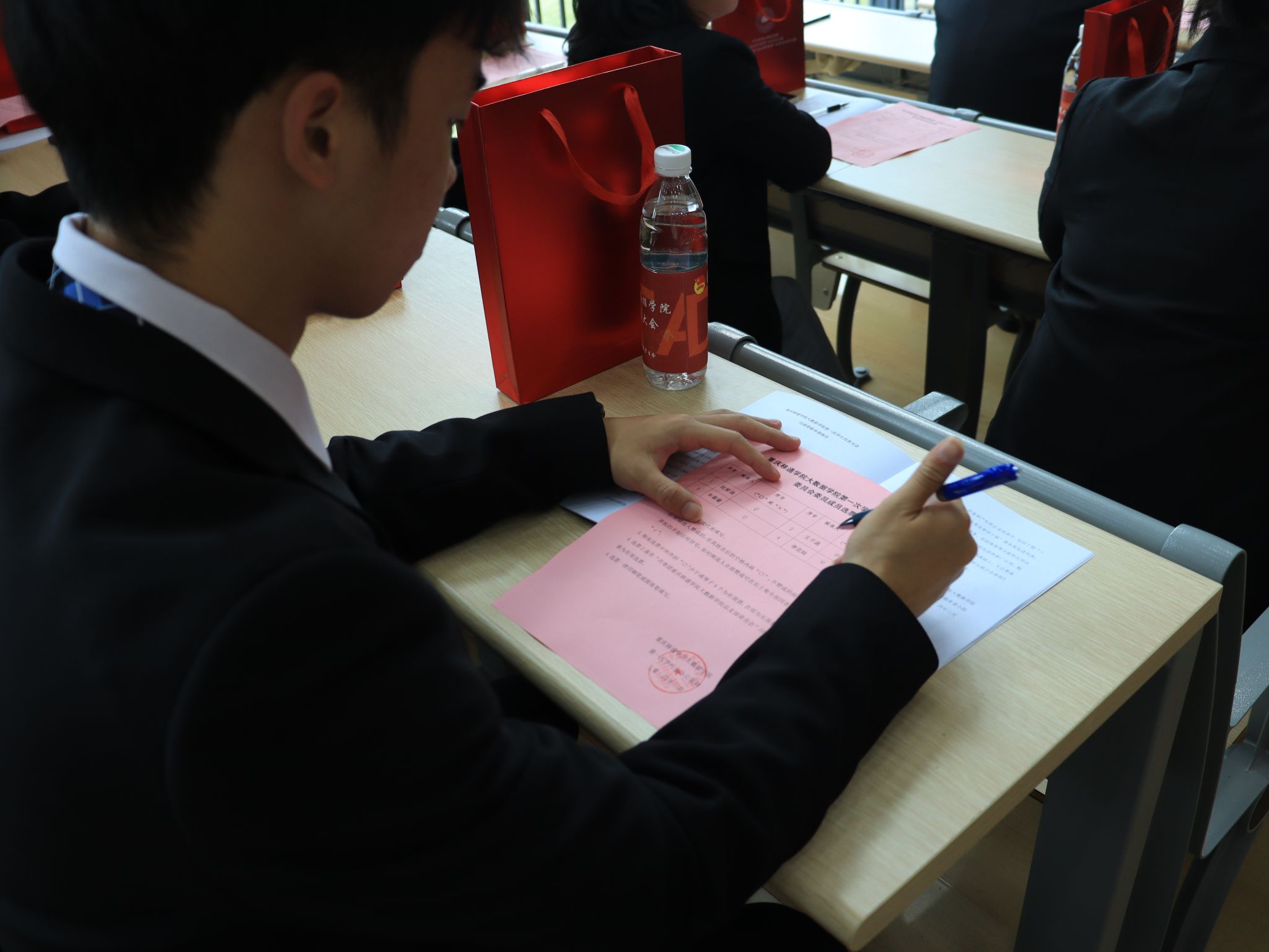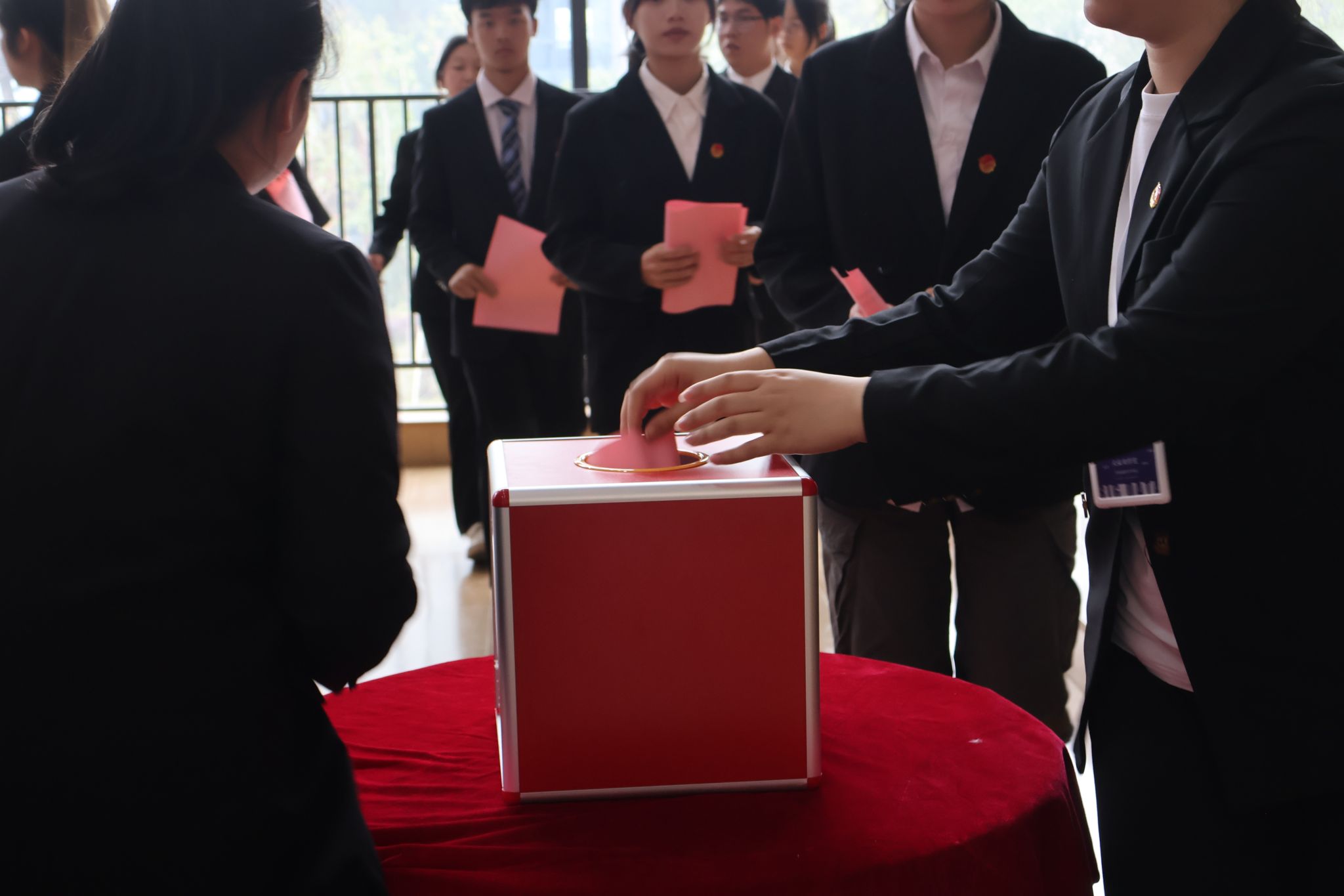 紧接着,进入选举环节,与会人员投票选举产生重庆移通学院大数据学院第一届学生委员会。由工作人员宣读了本次投票选举方式:采用无记名形式进行公开透明的选举,正式代表们和学生代表们依次上台投票,并在总监票人、监票人、总计票人、计票人公正公平的监督下完成投票选举,最终大会选出了委员名单。