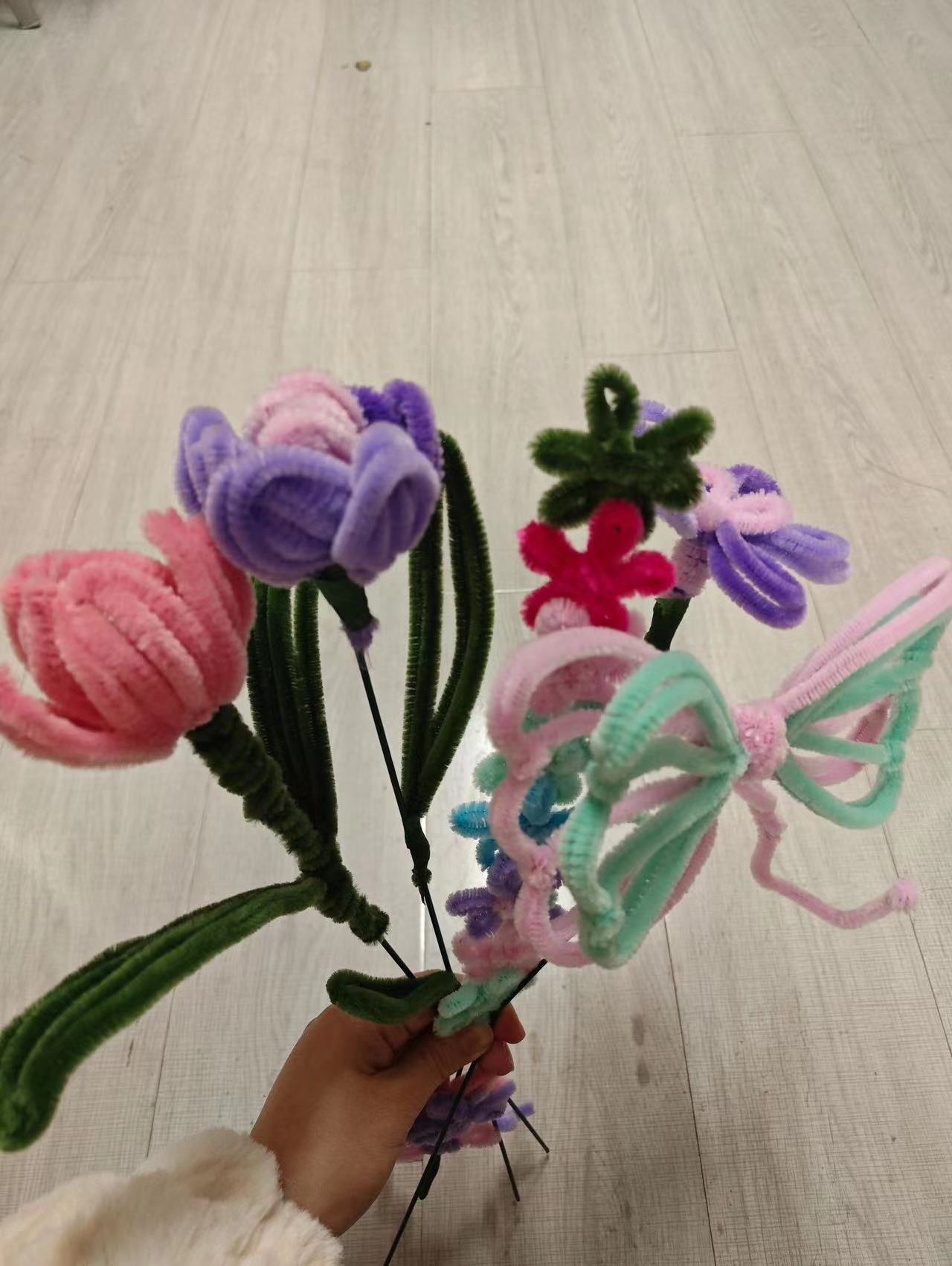 在活动中,同学们选择自己喜欢的扭扭棒颜色,制作成一朵朵精美的手工花,共同参与手工制作。同学们互相交流、合作和帮助,增进彼此的了解和信任,培养良好的团队合作精神,同时打破性别刻板印象,建立友善关系,营造班级里积极的学习环境。