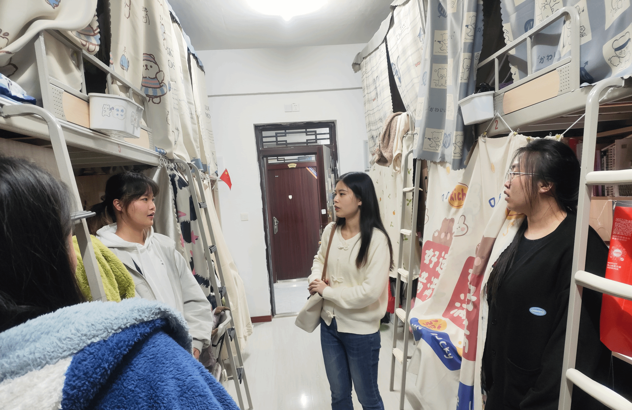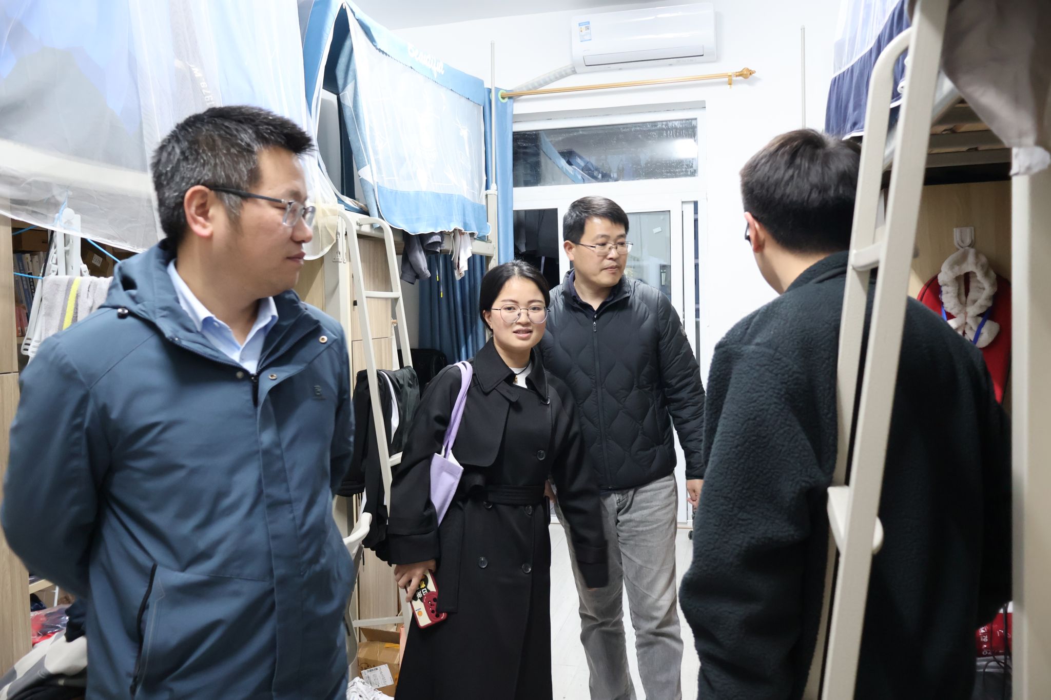 联合查寝活动的老师们首先来到綦河书院1号楼,深入宿舍,以朋友的身份与同学们面对面交谈,嘘寒问暖,关心同学们的学习状况,为同学们解答迷惑。并且提醒学生注意安全预防流感等春季传染病,多开窗通风,注意身体健康。与此同时,老师们关怀学生的就业方向,鼓励学生们多元发展,深入了解每位学生的特长优势,以便更好地促进学生成长。