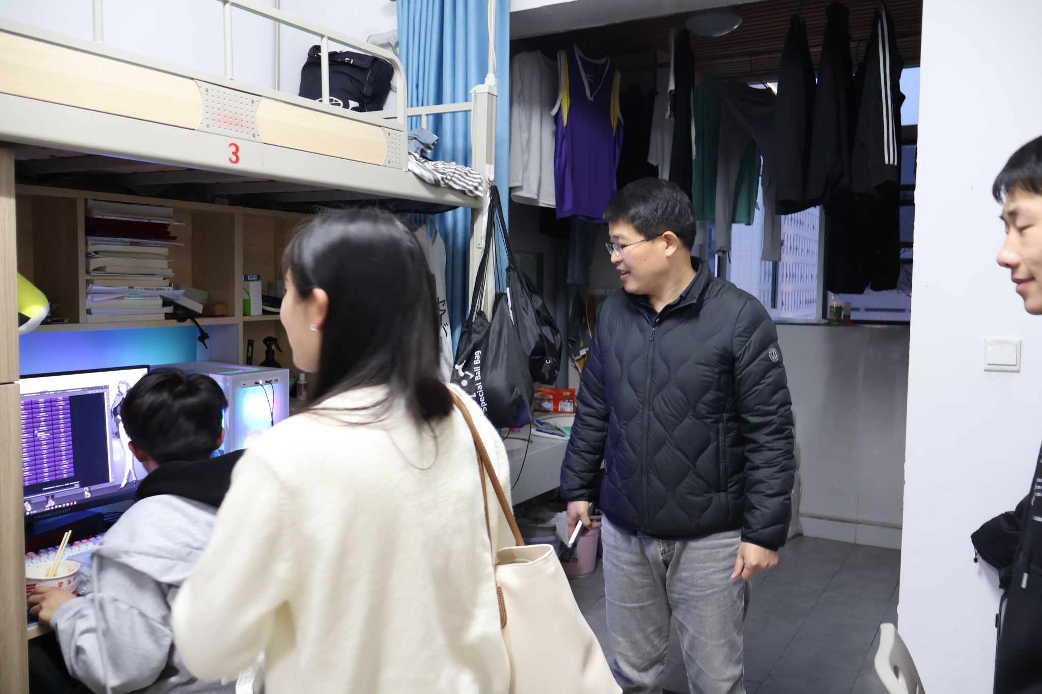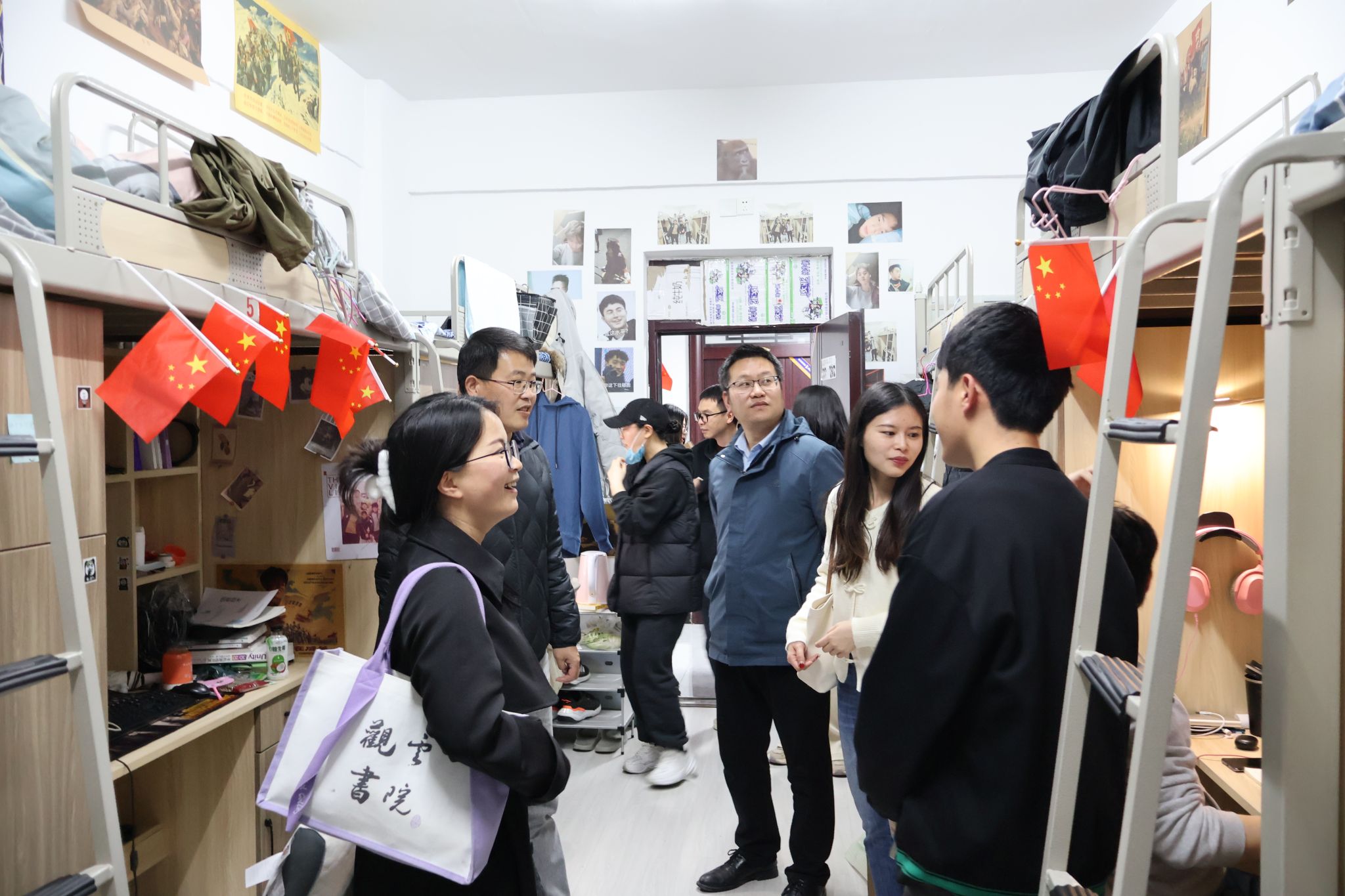 为更加全面了解学生在校生活状态和学习情况,掌握学生思想动态,培养学生养成良好的卫生行为习惯,优化宿舍生活环境,切实关心关爱学生发展成长,2024年3月19日晚19点,大数据学院院长闫会峰、副院长吕云山、副院长阙小梅,带领全体辅导员老师走进綦河书院、古剑书院等宿舍楼栋,开展了春季联合查寝活动。