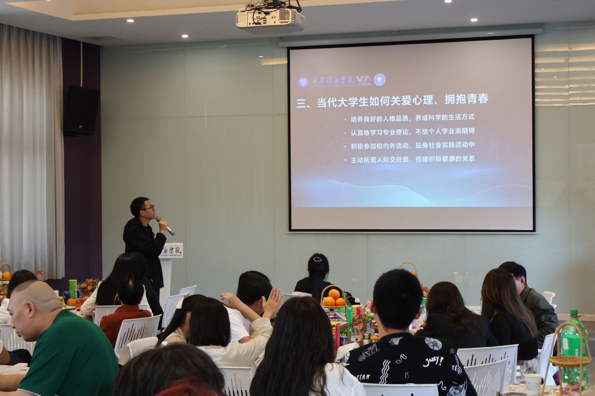 紧接着,学院学工办主任李进老师为家长们做了《当代大学生的心理健康与成长发展》的主题讲座,利用数据和案例带领家长理清大学生心理健康的重要性,分析了常见的心理障碍原因和化解方法,呼吁家长和学生们重视大学生心理健康,及时发现干预,帮助学生快乐生活和健康成长。最后,茶话座谈交流会在辅导员与家长们的自由交流环节中圆满结束。