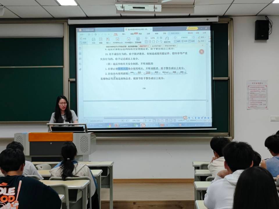 此外,部分辅导员结合学生管理制度、《重庆移通学院学生违纪处分办法》等内容,开展了学生违规违纪和日常行为习惯养成的宣传教育。辅导员老师强调了严禁私自校外住宿、不假离校、晚归未归、饮酒酗酒和使用违规;遵守用水用电安全,不使用大功率电器,不私接插座和电线,不在宿舍用明火;看管好贵重和随身物品,严禁偷盗、偷拍、留宿校外人员等违反学生管理制度的行为,希望大家能文明生活、健康生活、科学生活,做新时代文明大学生。