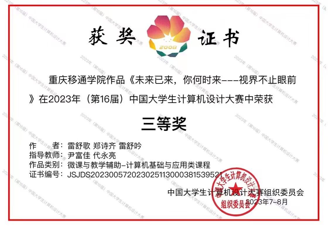 进入大学以来,我常对自己说不要留有遗憾,只有努力了才知道,无论结果如何,学习的过程也会受益匪浅。。于是在国家级、省市级和区校级的的比赛中,我通过勤奋努力,获得了30余项奖项,包括10余项国家级和市级奖项。