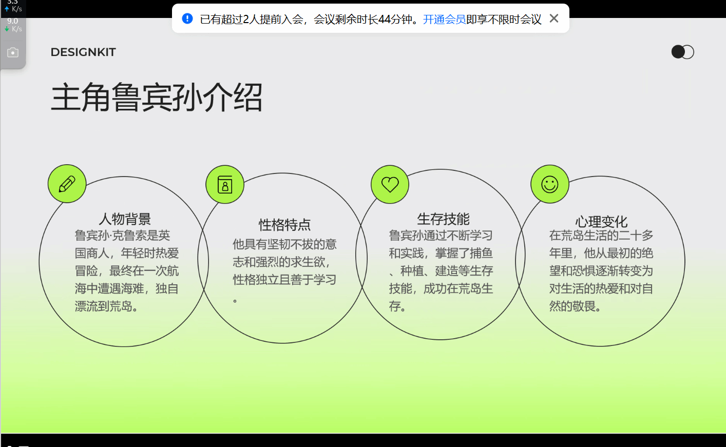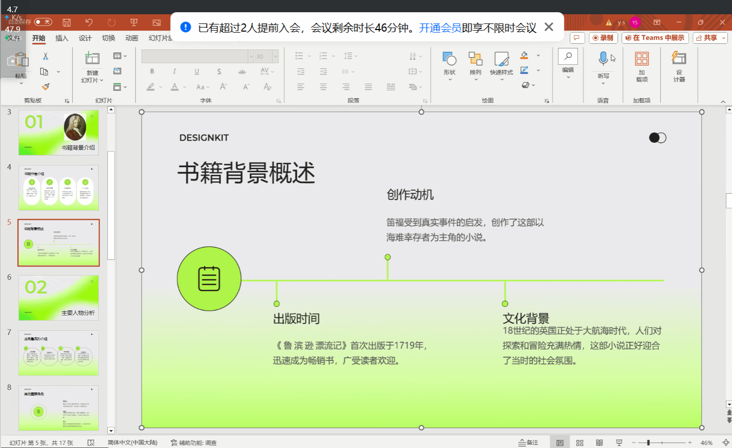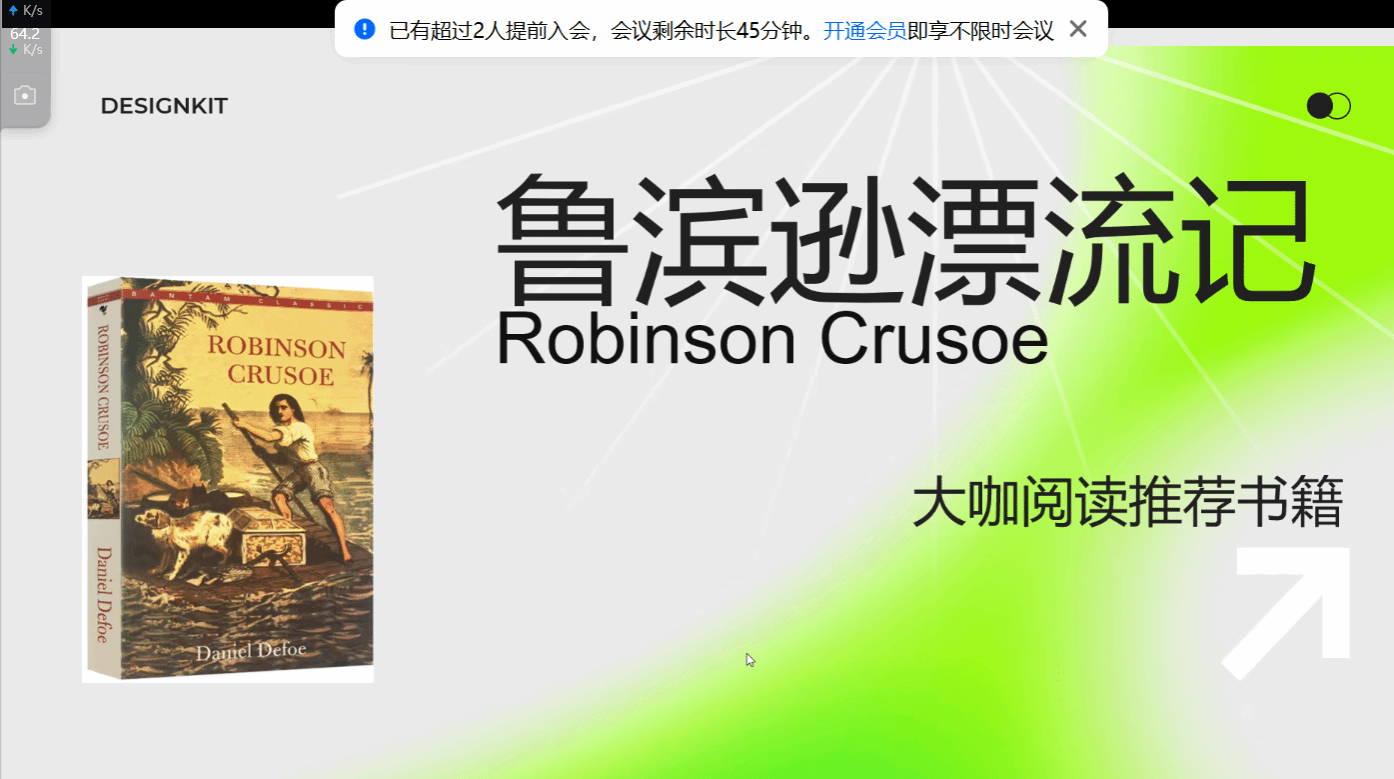 此次阅读大咖分享会,以主讲人汇报演示PPT,老师总结,拍合照三个部分进行展开。第六小组王梓豪同学依次从书籍背景,主要人物分析,阅读推荐与感悟这几个方面为我们讲述《鲁滨逊漂流记》这本书籍。并深刻解剖分析这本书中的精神内核,鼓励我们多向书中人物学习,拥有遇到问题不退缩、在逆境中冷静思考的能力。