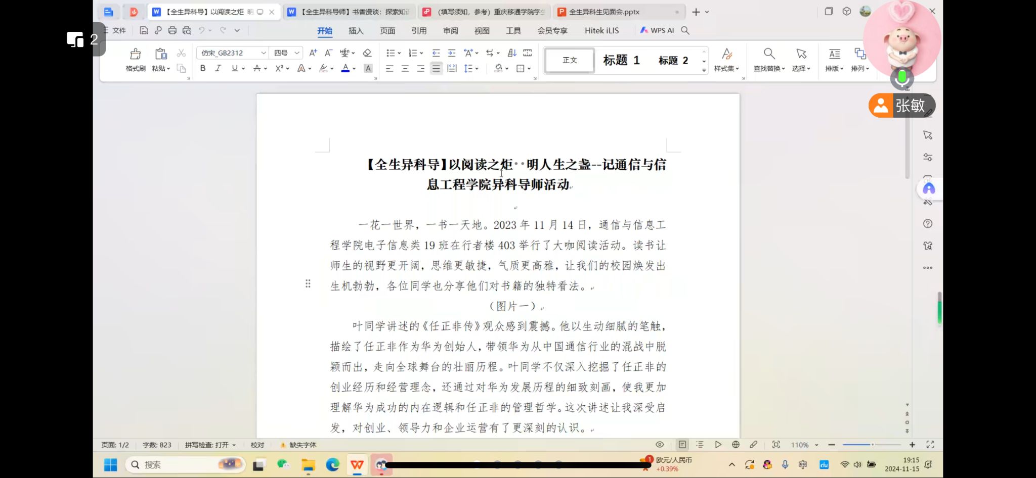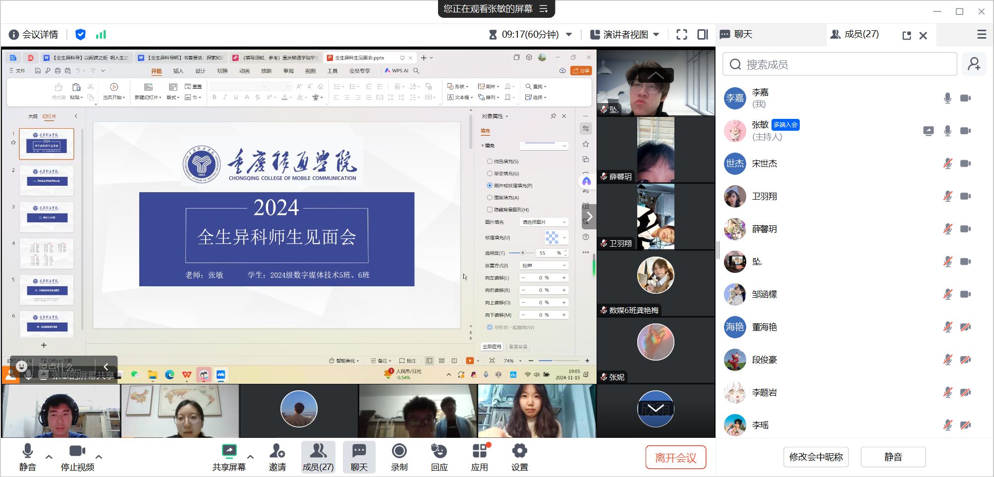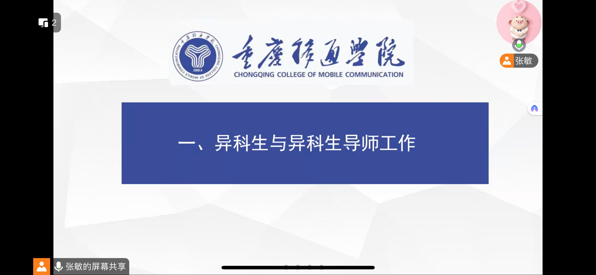 金秋送爽,硕果飘香,在这个充满活力与创新的秋季,2024年11月15日晚异科生导师张敏老师开展了一次以腾讯会议为载体的线上见面会,会议主题为“跨界融合,启迪未来”,主要分为四个议程,分别如下: