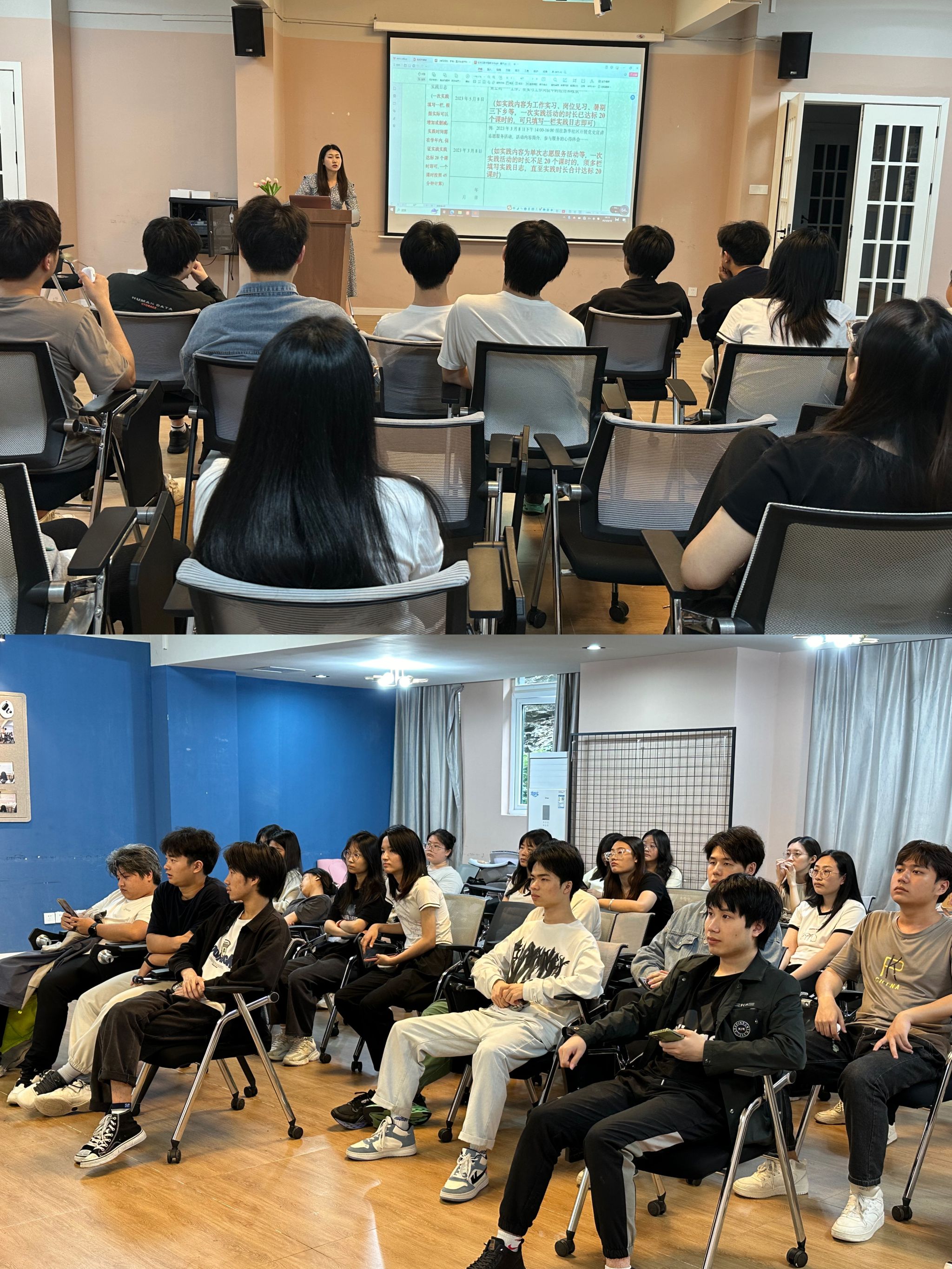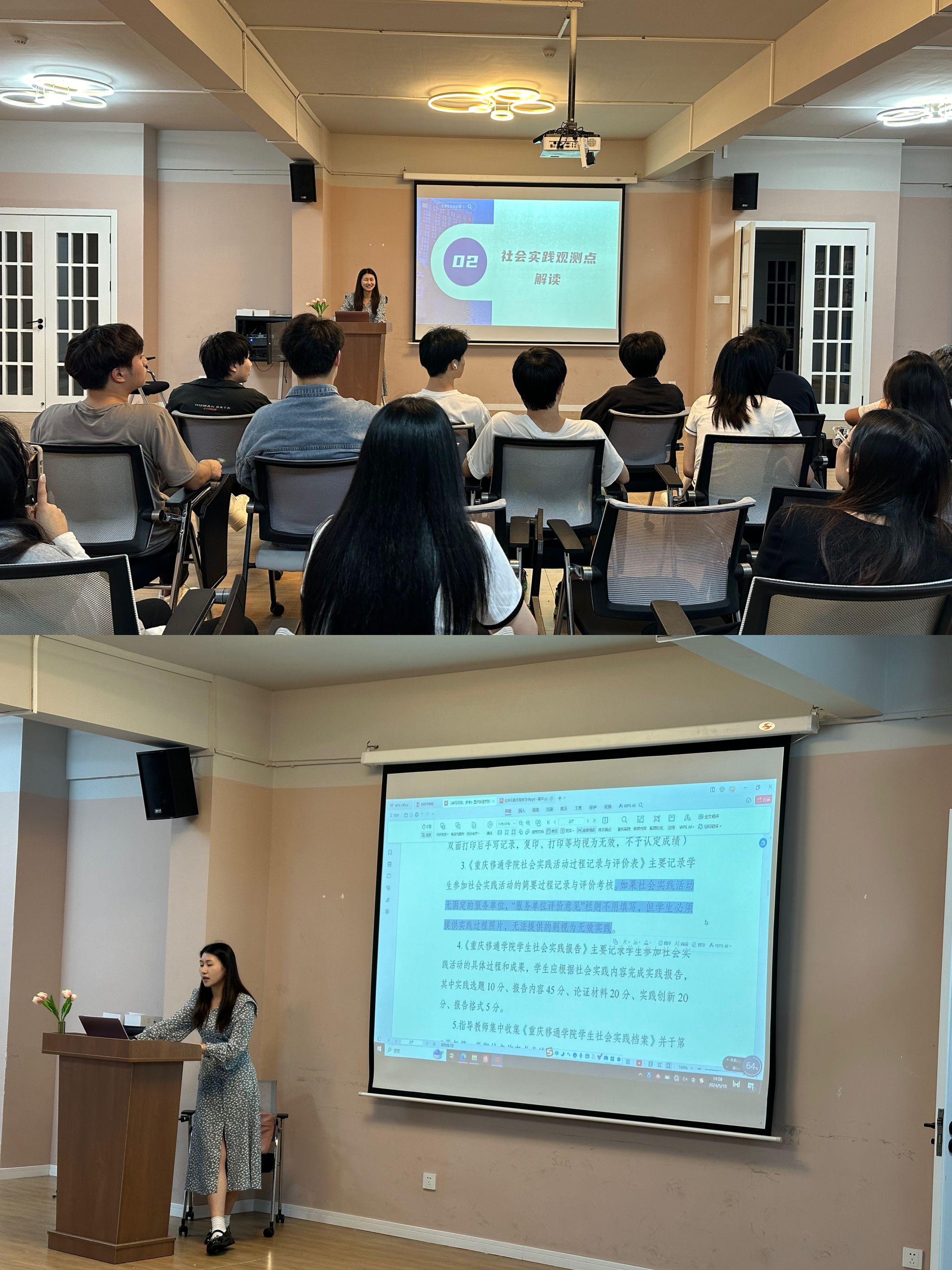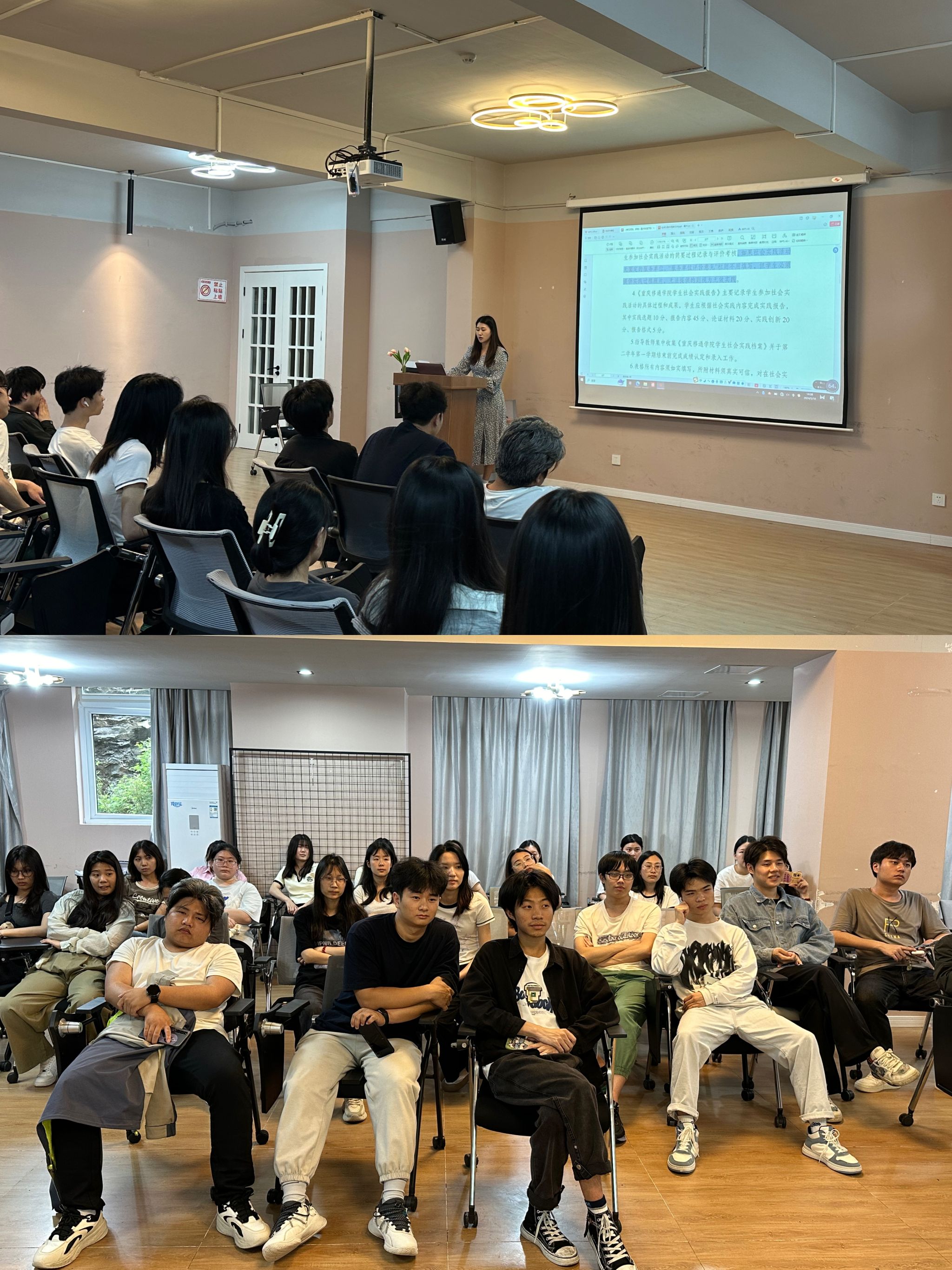 首先,吴老师对《重庆移通学院学生社会实践活动管理办法(试行)》进行了详细的解读,让同学们明白社会实践活动是高等学校教育教学内容的重要组成部分,是培养学生理论联系实际、提升综合素质、融入并服务社会的重要环节,是帮助同学们了解社会、认识国情、增长才干、奉献社会、锻炼毅力、培养品格的有效方式。