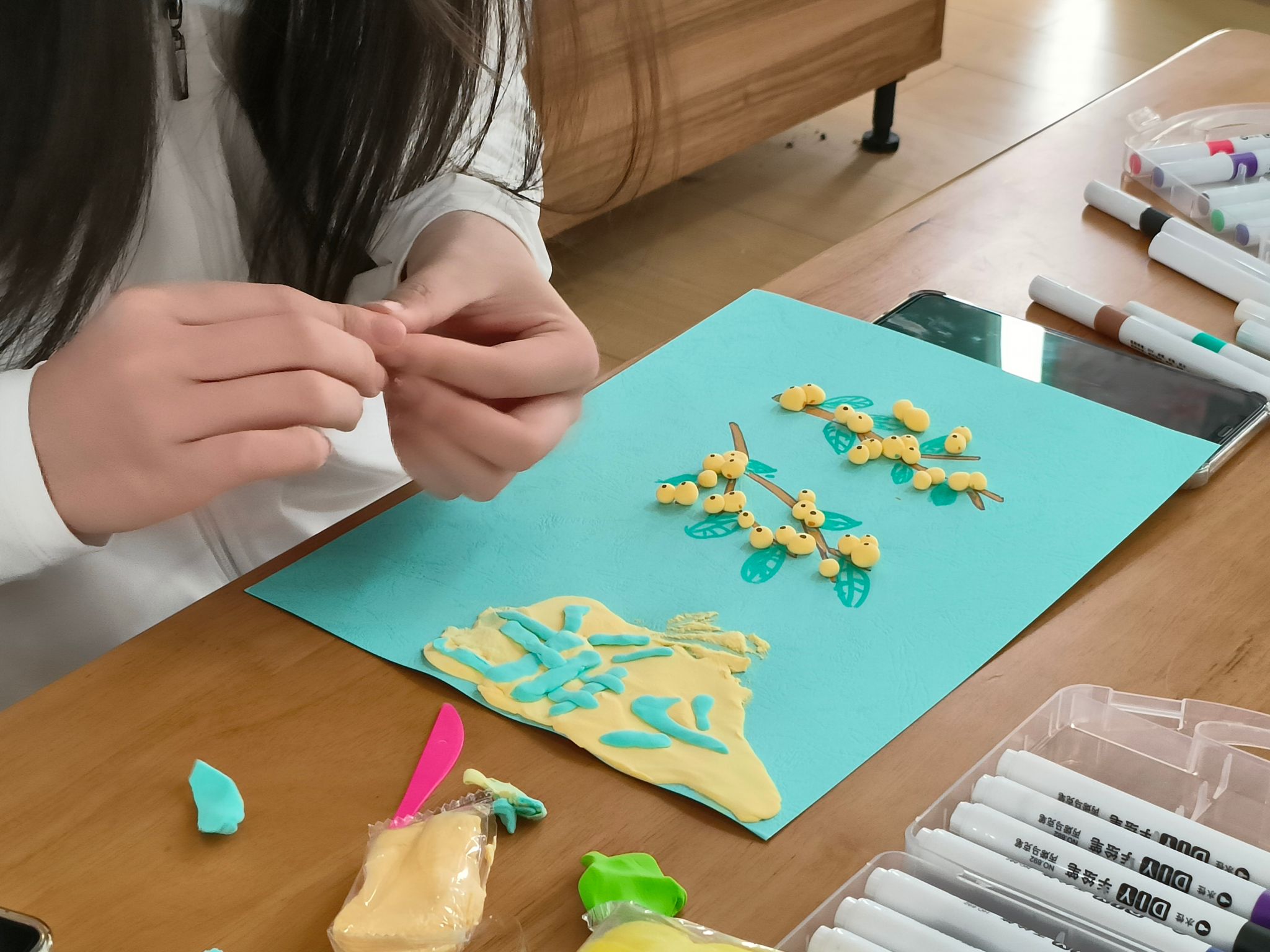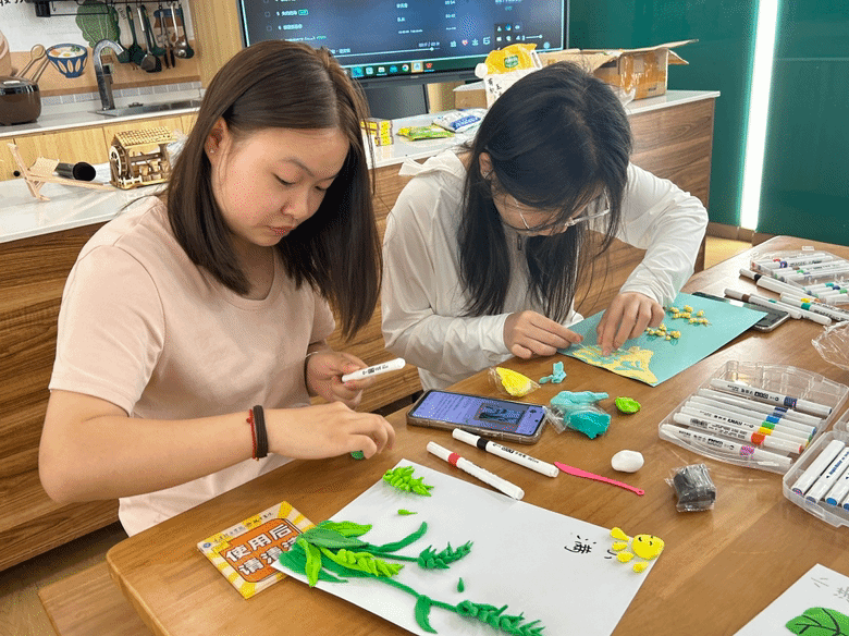 根据小满时节麦子和枇杷渐熟的物候现象,工作人员为同学们提供了粘土和卡纸,使同学们可以用粘土还原小满农作物的不同特征。在观看完制作视频后,同学们开始挑选各色的粘土,利用揉捏或者搓压等手法,将粘土创作成不同形状,并用特制工具固定在卡纸上。他们展示出的技巧和创意让人赞叹,每一个作品都透露着对农耕智慧的敬仰和对农民辛勤劳作的赞美,也为同学们带来了动手制作的乐趣。