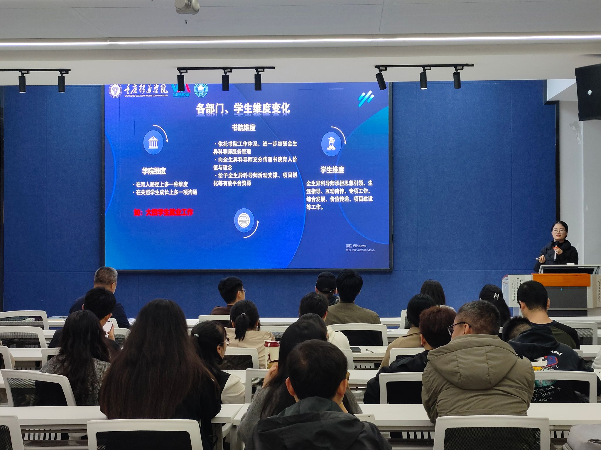 2024年11月13日下午19:00,重庆移通学院大数据学院在綦河书院观涛·多功能报告厅成功举办2024-2025学年第一学期全生异科导师交流会,此次会议旨在全面贯彻落实学校“全生异科导师制”工作要求,进一步推动“完满教育”的素质教育要求,落实学校“四位一体+双院制”特色人才培养体系。会议由大数据学院异科导师负责人郝月霜老师主持,大数据学院院长潘显兵、大数据学院副院长阙小梅、大数据学院异科导师负责人及全体异科导师参会。