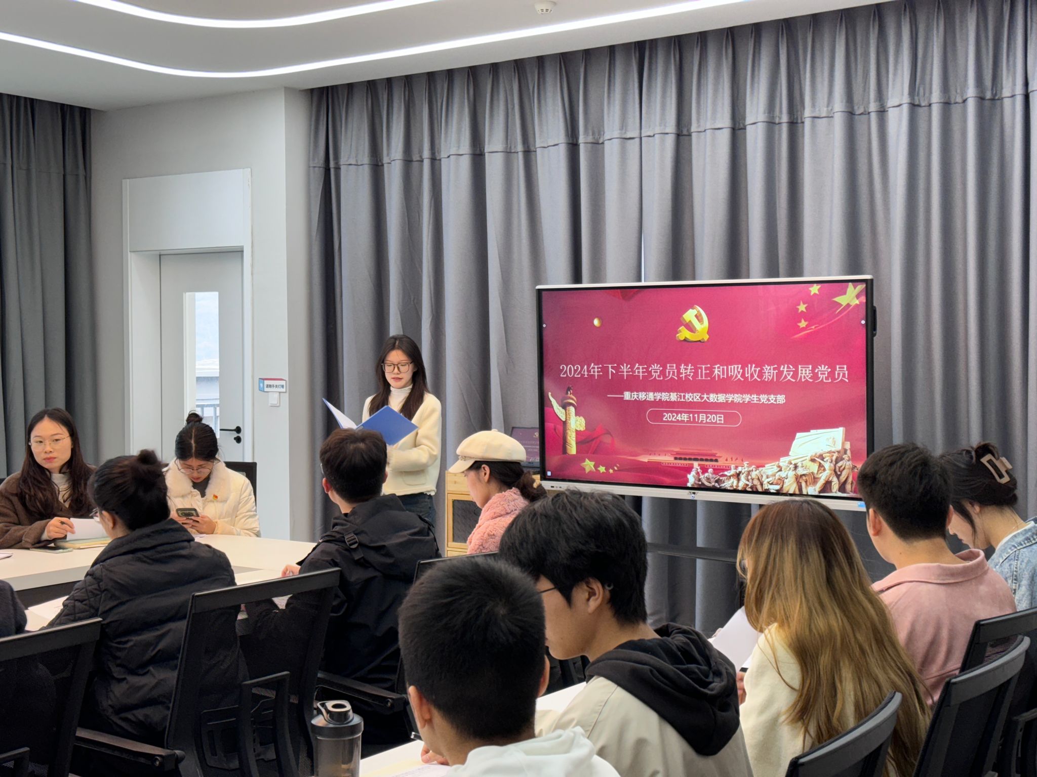 根据中共重庆移通学院大数据学院学生党支部发展党员工作计划,经征求党员和群众意见、支部大会审查同意,大数据学院学生党支部于2024年11月20日在玉棠书院地心会议室召开了2024年下半年党员转正和吸收新发展党员大会。本次大会旨在审议曾珂、甘艳平等6名同志为中共正式党员问题和于辰茜、刘昕等7名同志为中共预备党员问题。会议由朱文杰同学主持,孙权伟老师清点并报告到会情况。大数据学院学生党支部61人,应到会有表决权的正式党员45人,实到会有表决权的正式党员39人,符合《中国共产党发展党员工作细则》之规定,可以进行开会议程。